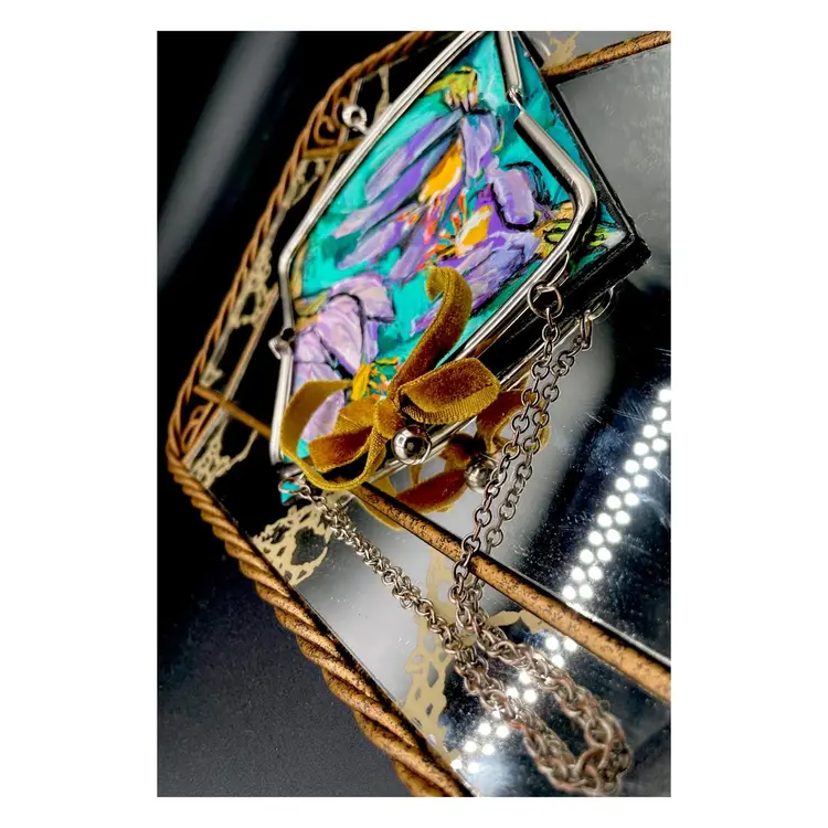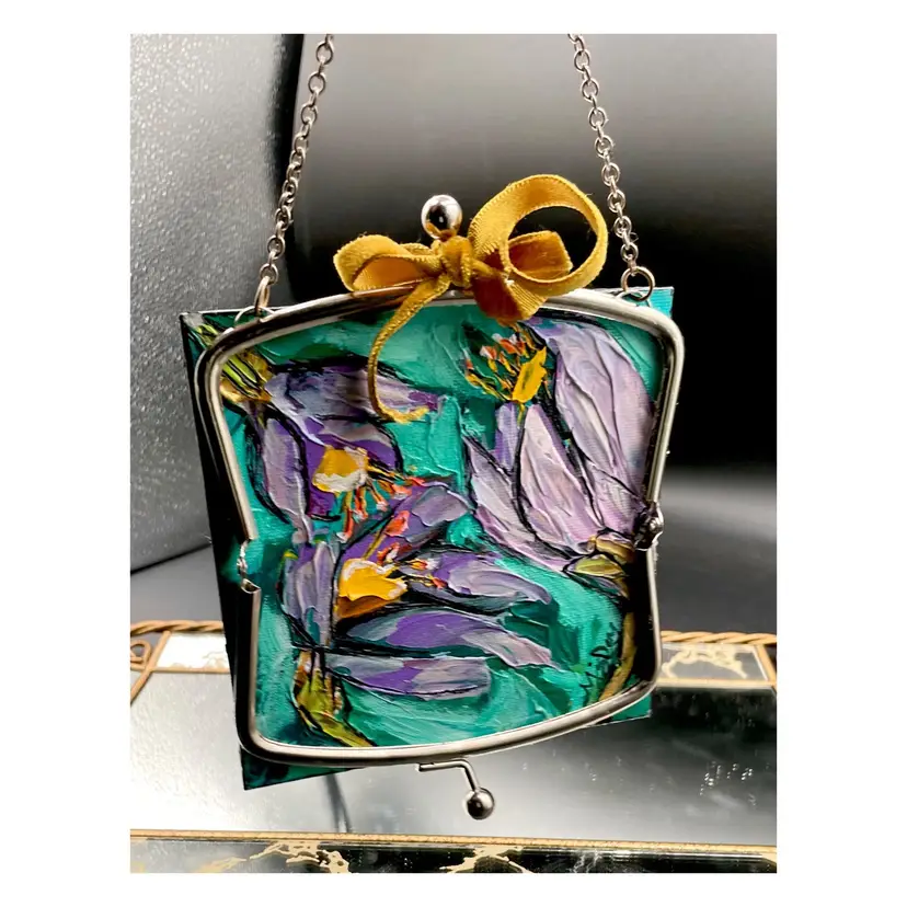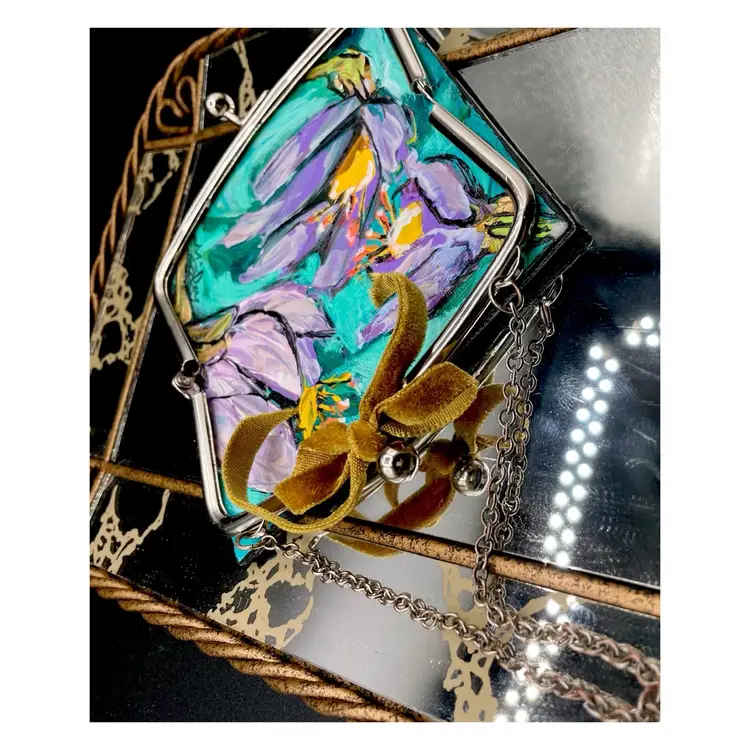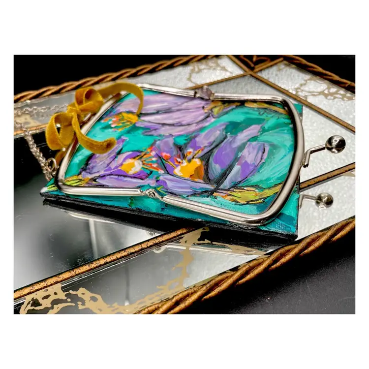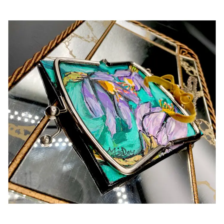 New, original flower painting On 5”x5” canvas panel With attached vintage purse frame. Good condition. Acrylic painting. #1176