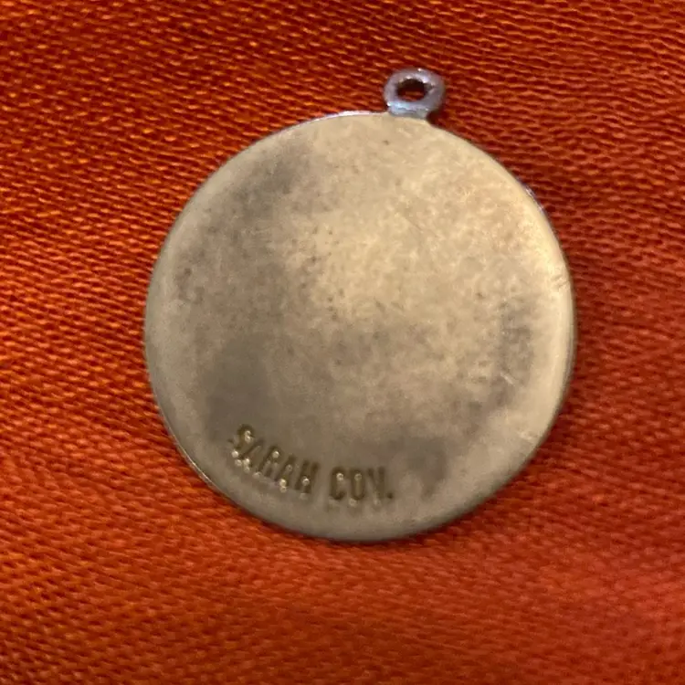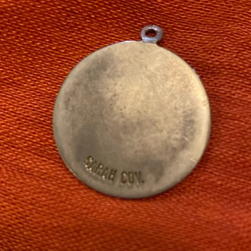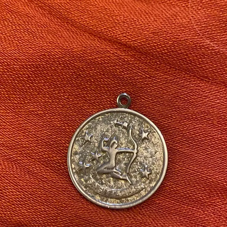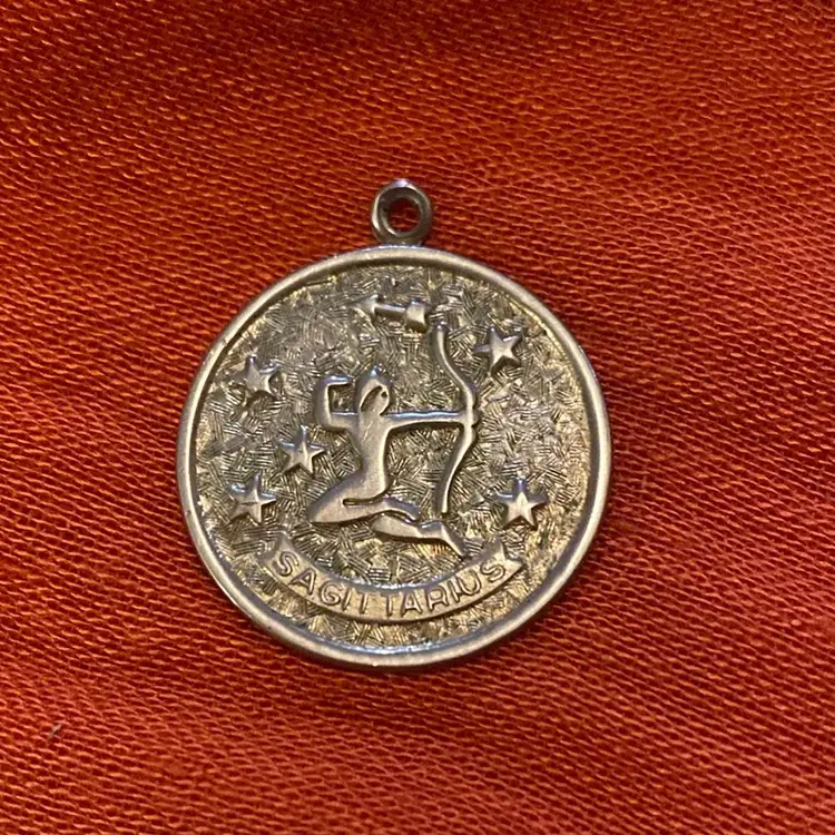 This one inch pendant bears the zodiac sign Sagittarius. It’s gold toned and was made in the 70s by Sarah Coventry.