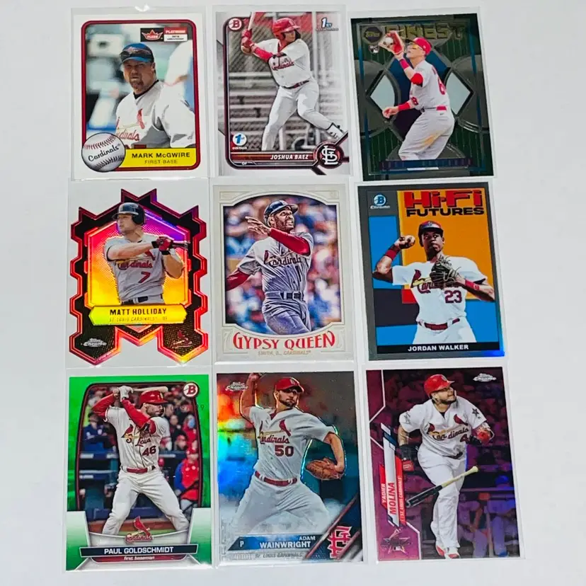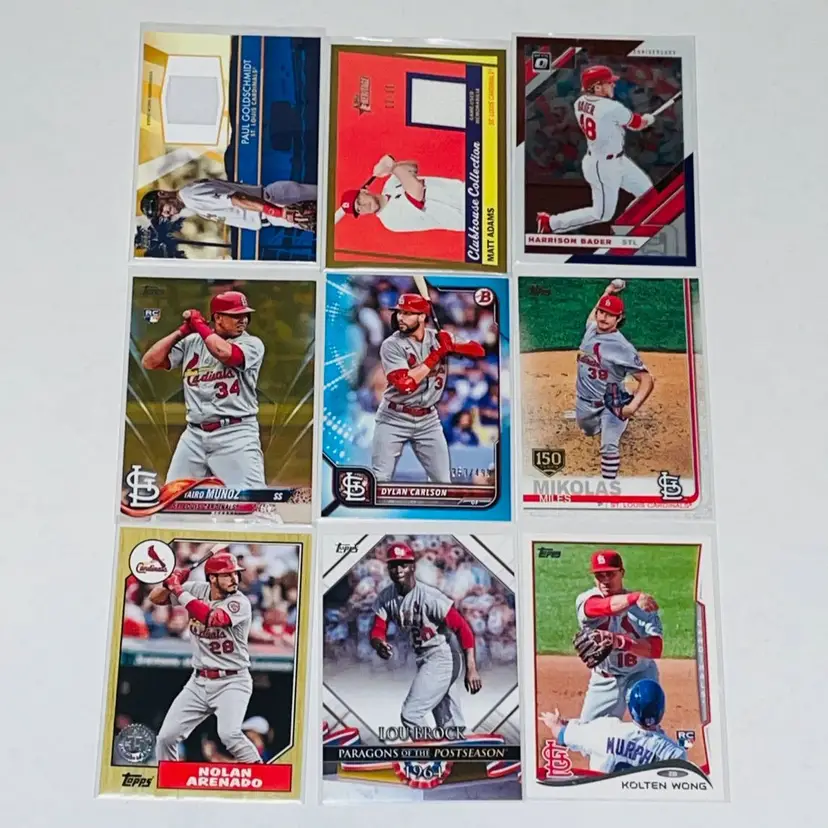 Paul Goldschmidt Topps relic Matt Adams heritage gold relic /99 Harrison Badger optic /150 Yairo Munoz update gold RC /2018 Dylan Carlson bowman sky blue /499 Miles Mikolas Topps 150th stamp - print run of 25 Nolan Arenado topps insert Lou Brock topps insert Kolten Wong Topps RC Mark McGwire Fleer platinum Joshua Baez bowman 1st edition Lars Nootbarr finest flashbacks RC Matt Holliday Topps chrome die-cut insert Ozzie Smith GQ SP Jordan Walker BC insert Paul Goldschmidt bowman green /399 Adam Wainright topps chrome refractor Yadier Molina chrome update pink refractor