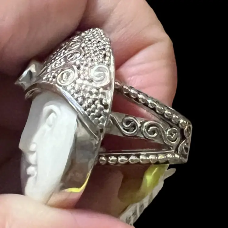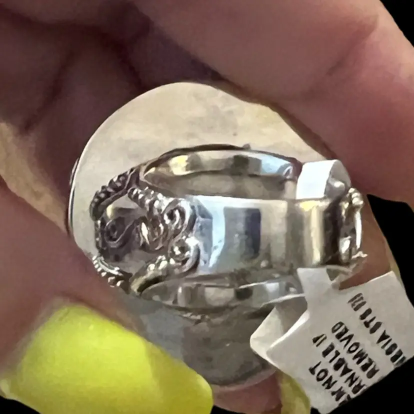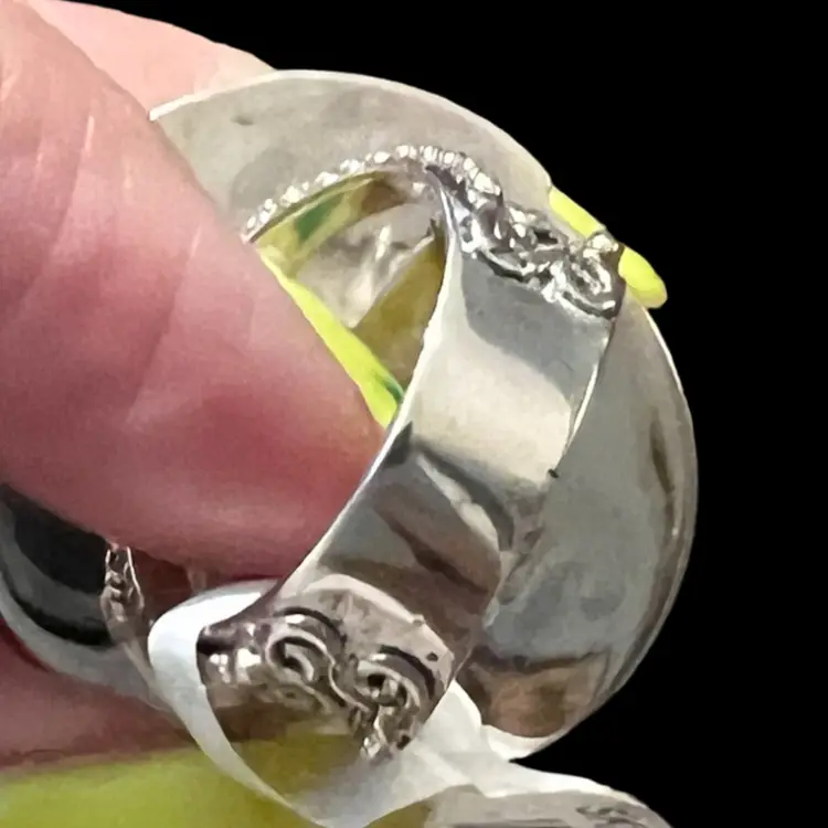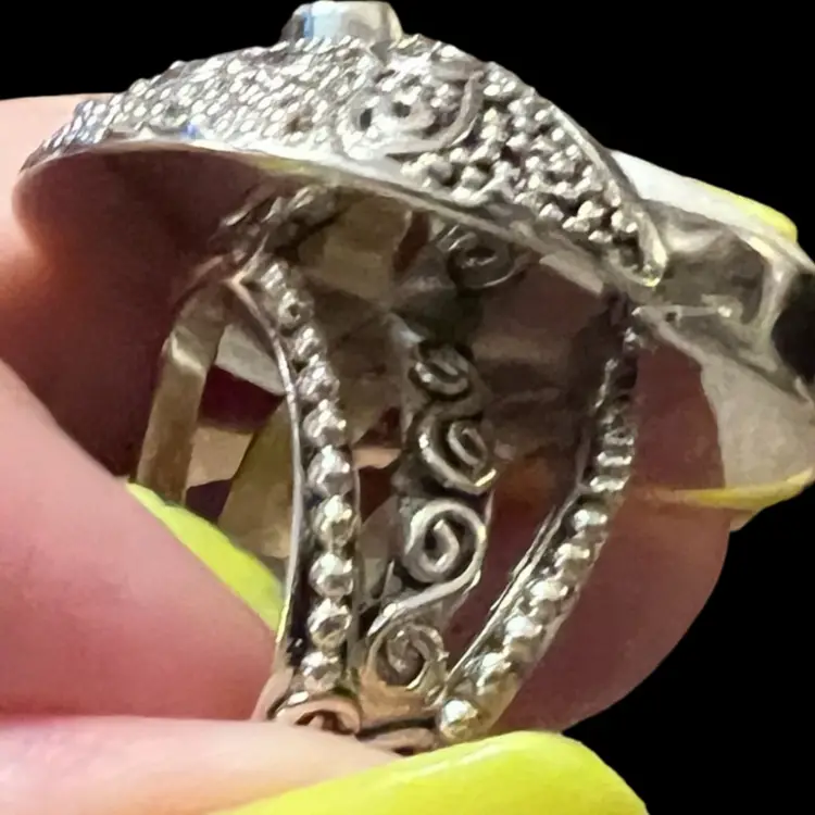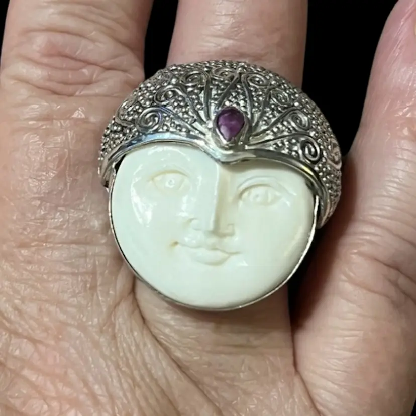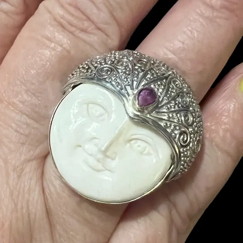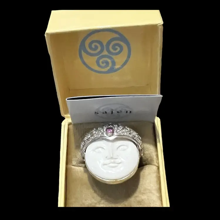 This ring is 925 and is marked Sajen 925; it is NWT. It is carved bone with a hot pink sapphire.