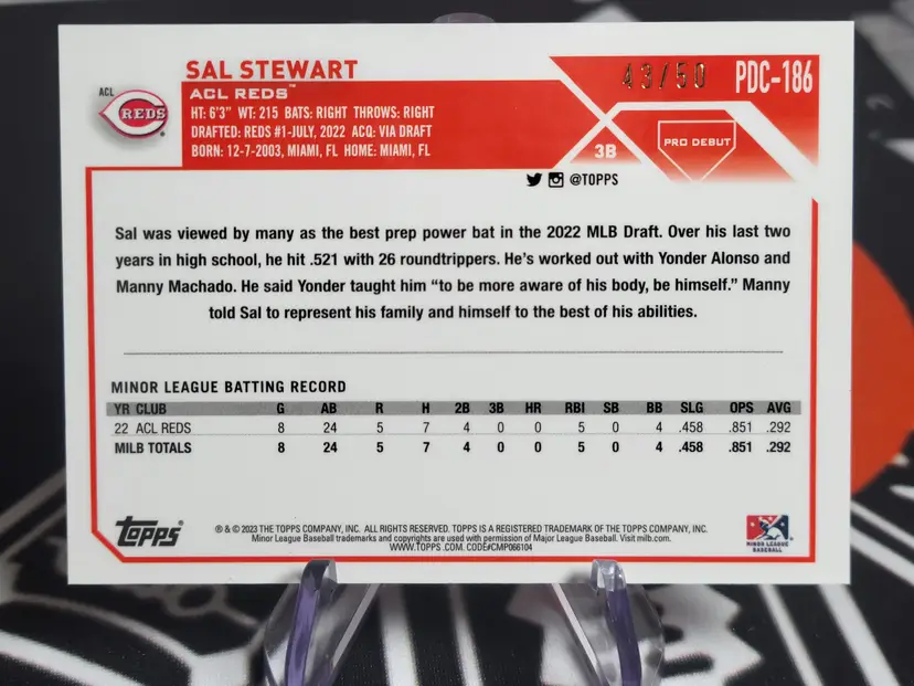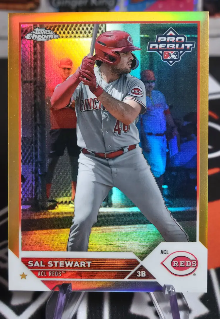 2023 Topps Pro Debut Chrome Sal Stewart Gold Refractor serial-numbered 43/50, card #PDC-186 featuring the Cincinnati Reds. This low-numbered parallel from the Chrome version of the Topps Pro Debut release provides strong investment potential for Reds fans, rookie card collectors, or Chrome parallel runners.