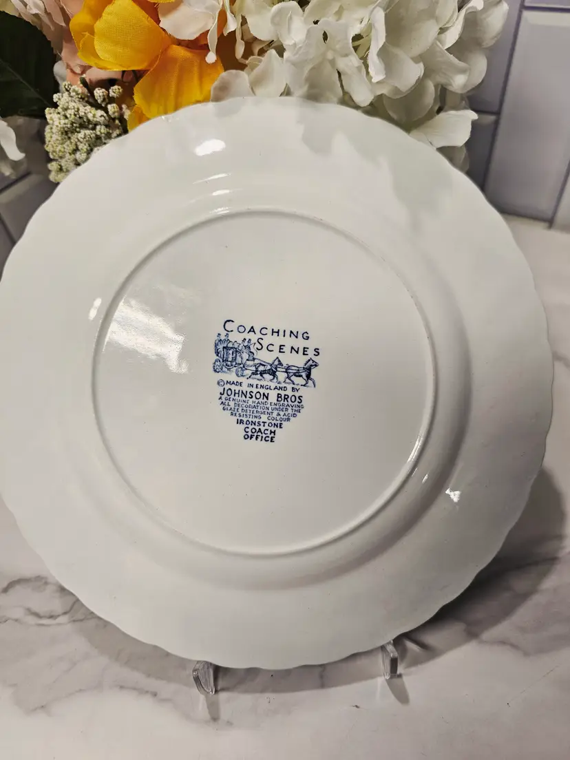 Made by: Johnson Brothers Pattern: Coaching Scenes Blue (Discontinued) Place of Origin: England Type of China: Salad Plate Measurement: Diameter: 7 3/4 in Markings: SEE PIC Condition: Used, inspected for quality and in excellent condition per listing SOLD AS IS NO RETURNS Shipping: Most Mondays, Wednesdays & Fridays SKU:250229