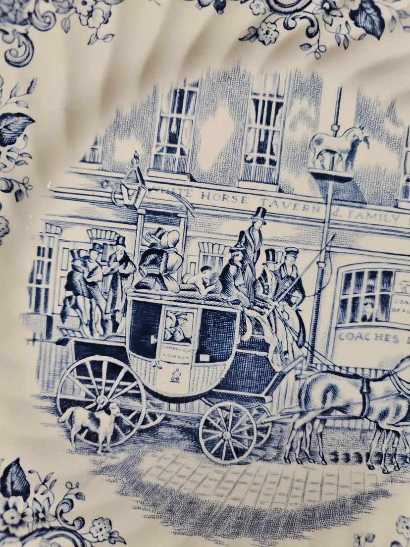 This single salad plate from Johnson Brothers’ Coaching Scenes Blue collection features a richly detailed transferware scene of a horse-drawn carriage arriving at the “Coach & Horses” inn, with figures gathered outside in 19th-century attire. The cobalt blue imagery is framed by an ornate floral border and scalloped edge, adding elegance and storytelling to your table. Ideal for serving salads, desserts, or as a display piece, this plate brings vintage charm and historical flair to any setting. Crafted in England, this piece reflects Johnson Brothers’ legacy of durable ironstone and nostalgic design — perfect for collectors or lovers of traditional English tableware.