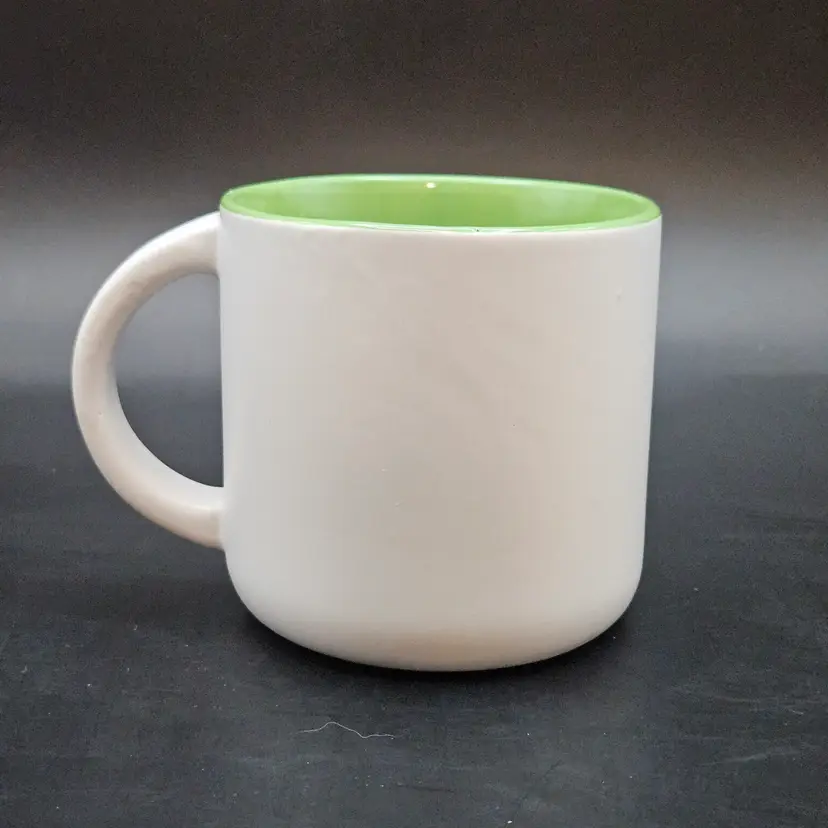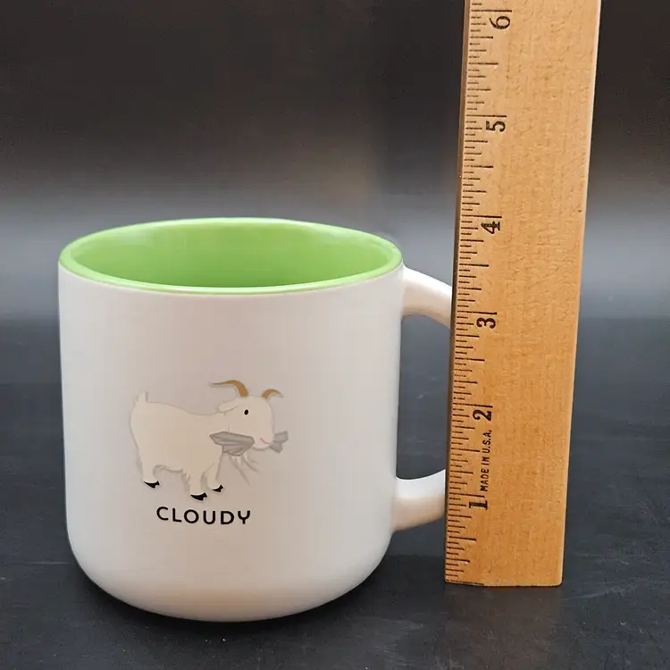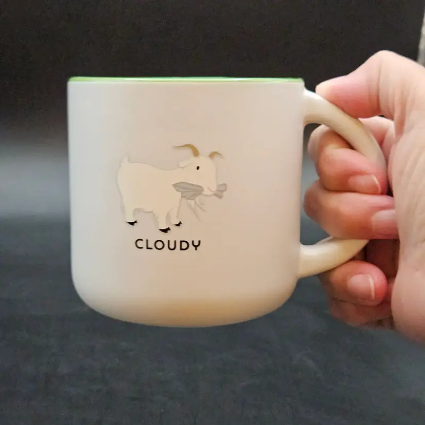 Salesforce "Cloudy" Trailblazer Mug. It features a white exterior and a distinctive bright green interior. The front has a cartoon illustration of "Cloudy" the goat. The goat is a popular character from the Salesforce ecosystem. Cloudy the goat, shown with a tuft of grass in its mouth. Made of a heavyweight ceramic.