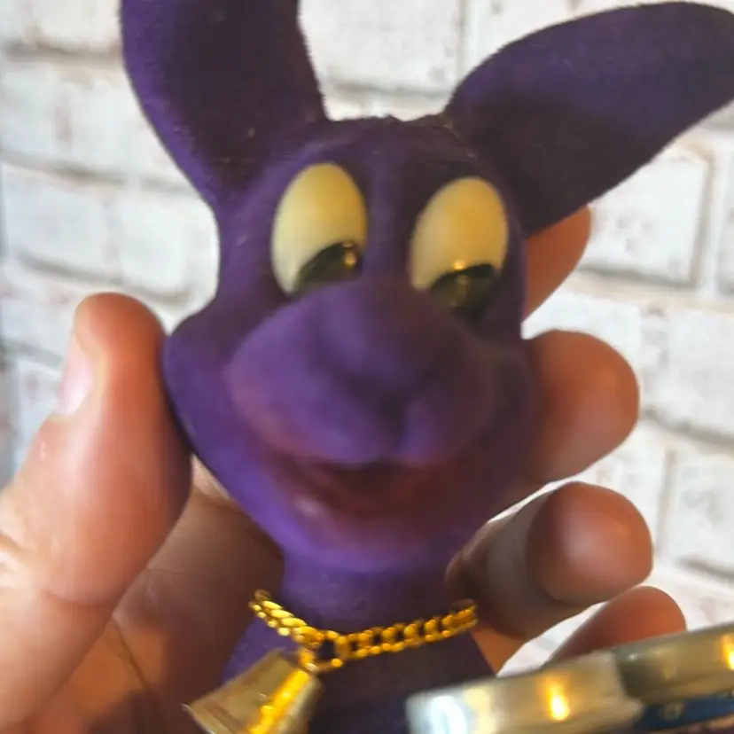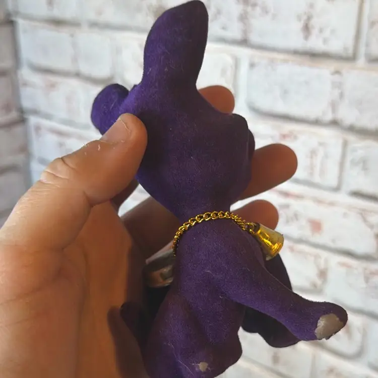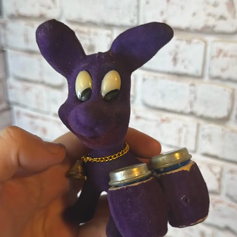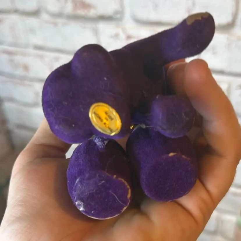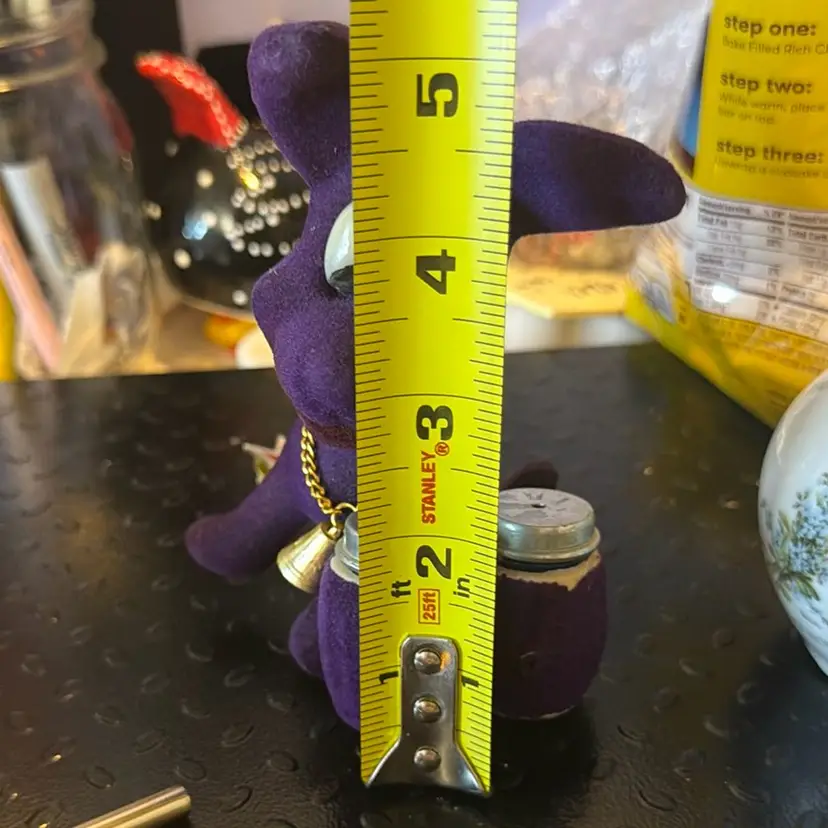 Made in Hong Kong and measured at 5.7” tall and fuzz is coming off and paint or red is smeared