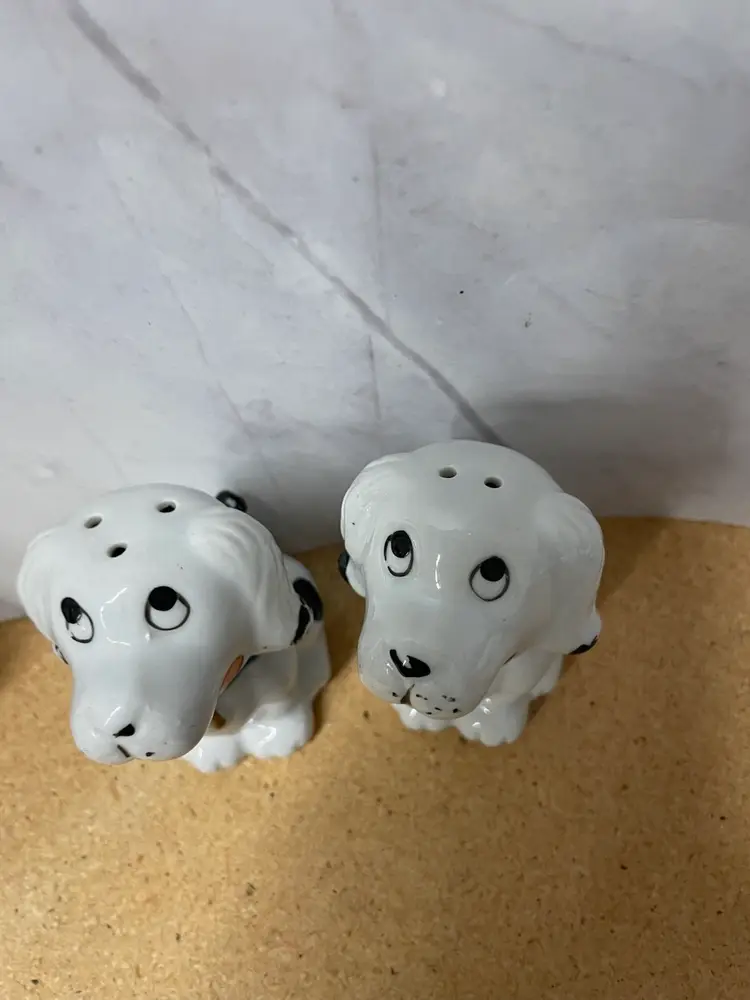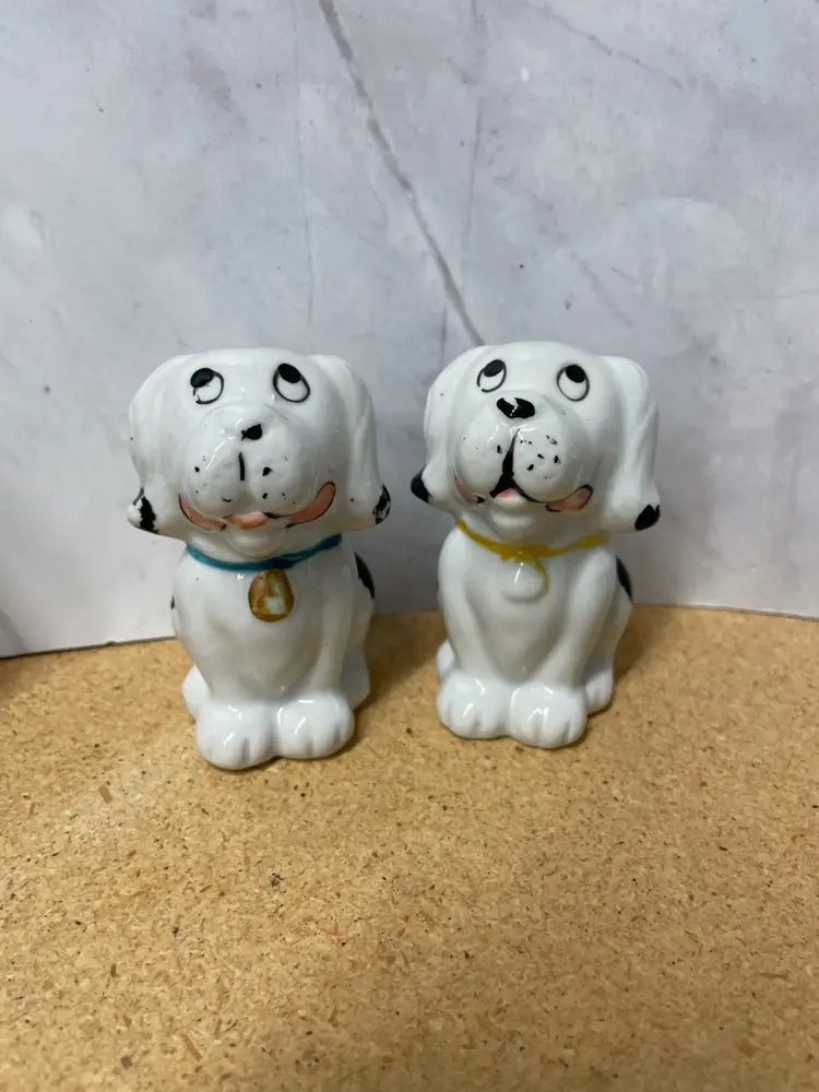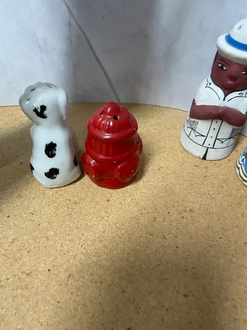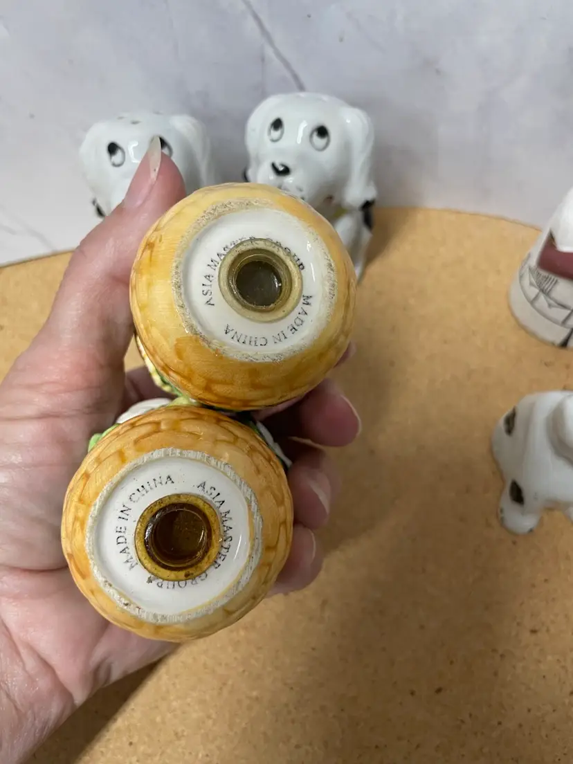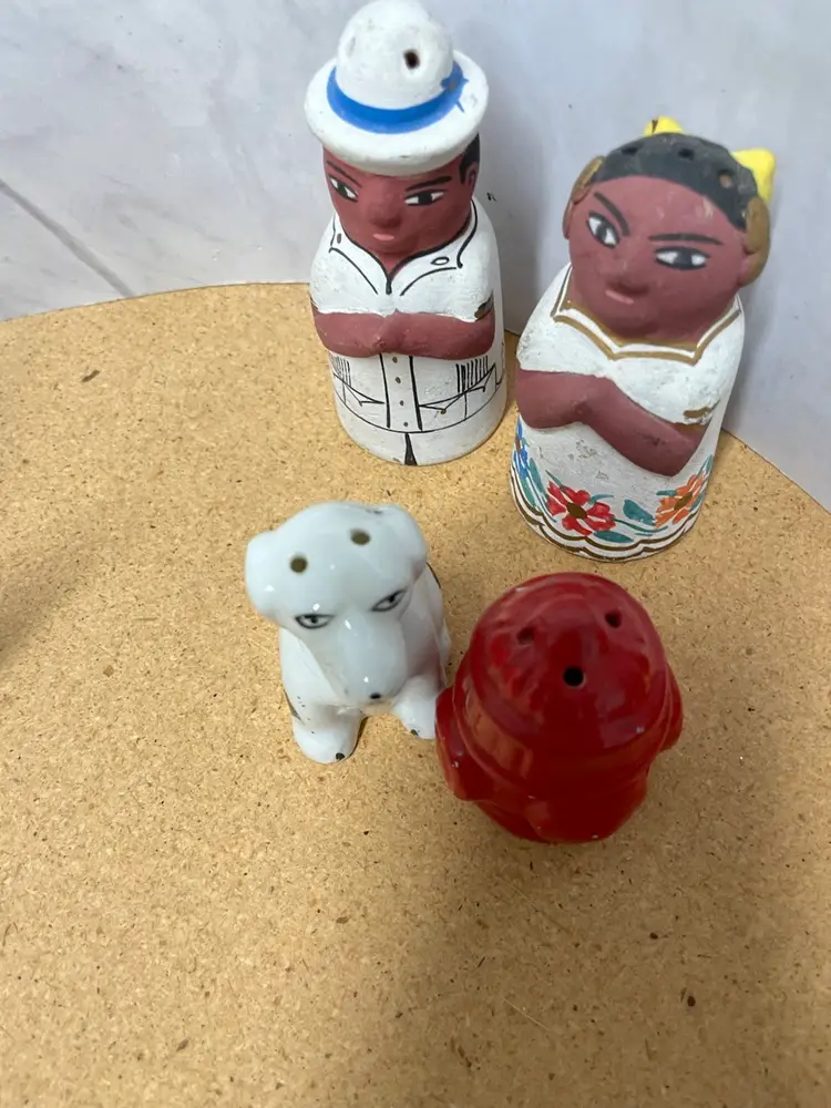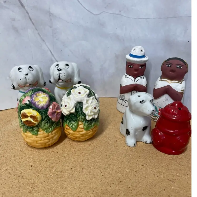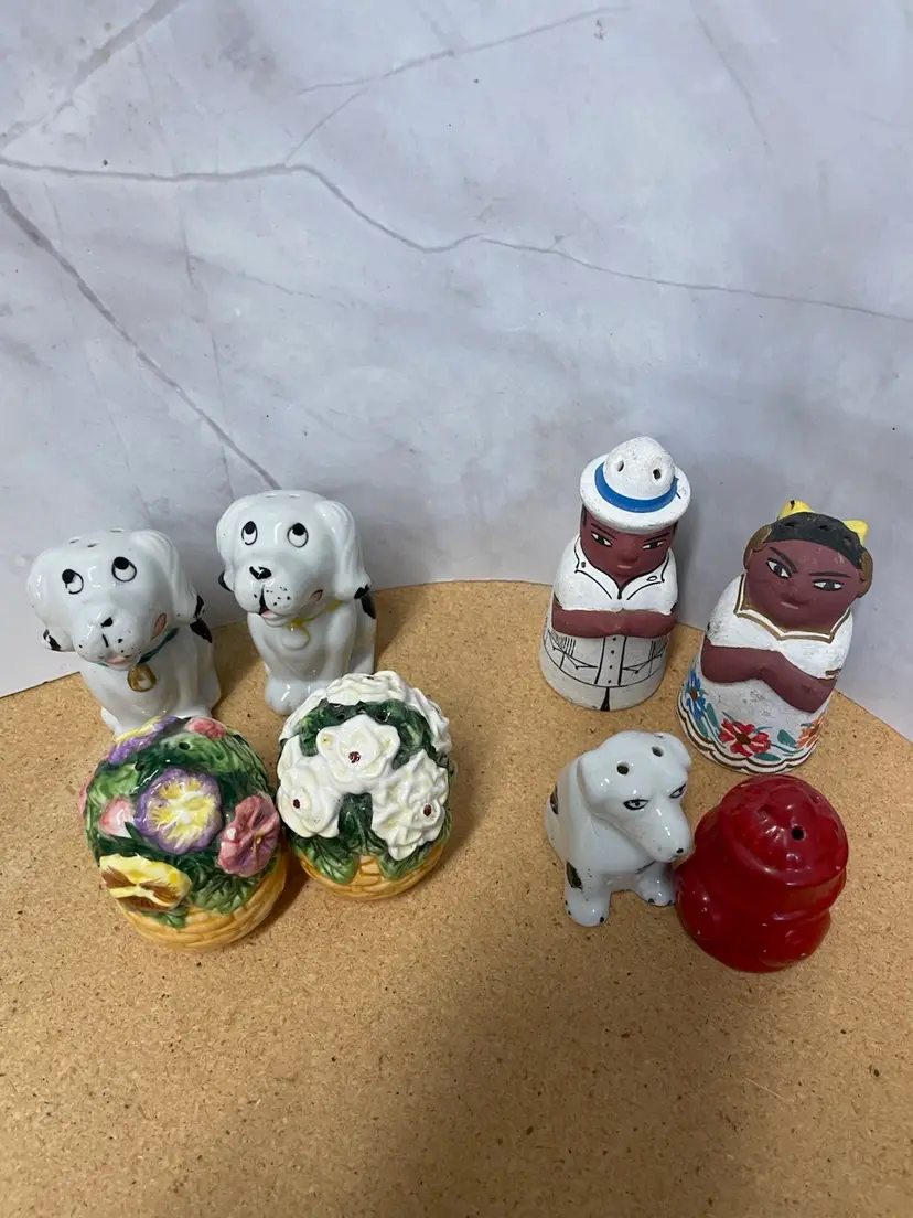 Salt and pepper shakers –Lot of 4 sets. Dalmatian and fire hydrant – with stoppers – cold painted with some minor paint wear. Asia master group flower basket shakers – ceramic – white flowers have chip on leaves – see pictures. Black and white cold painted dogs – yellow collar, blue collar – paint wear – with stoppers. Red plate pottery Allen theme couple – her yellow bow has been repaired – no stopper