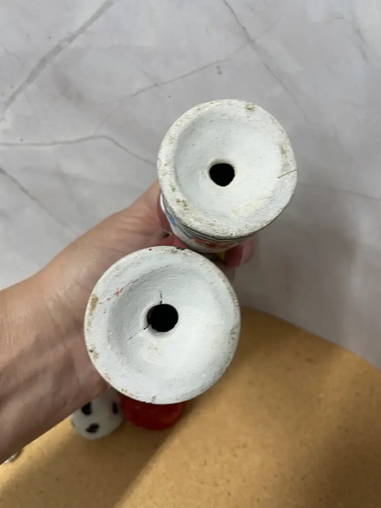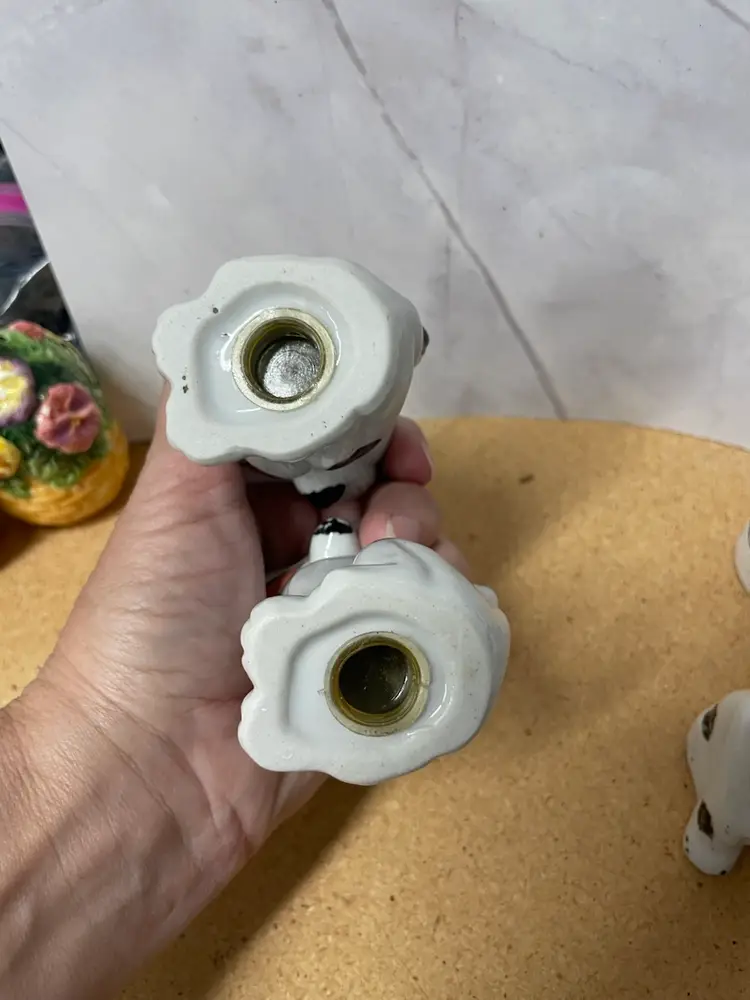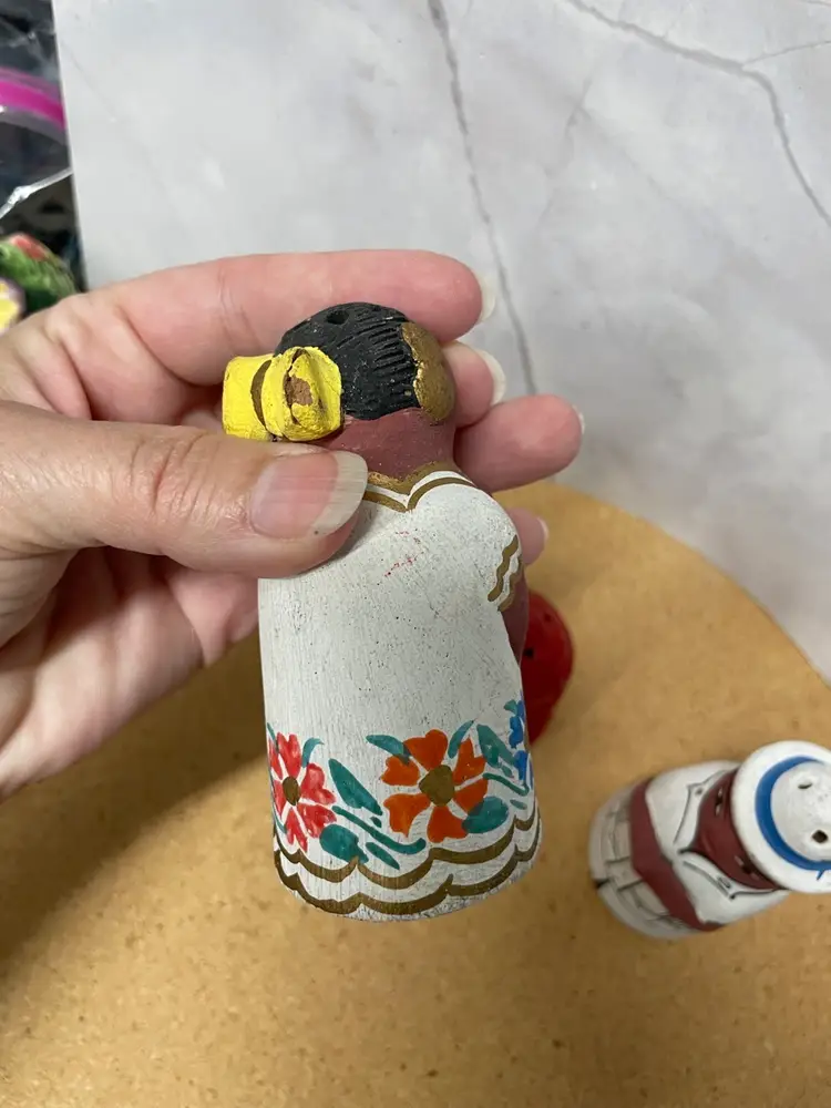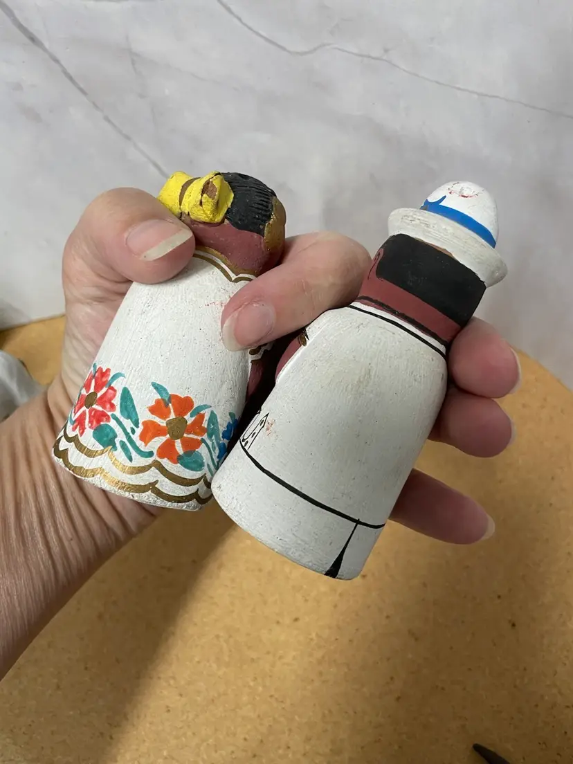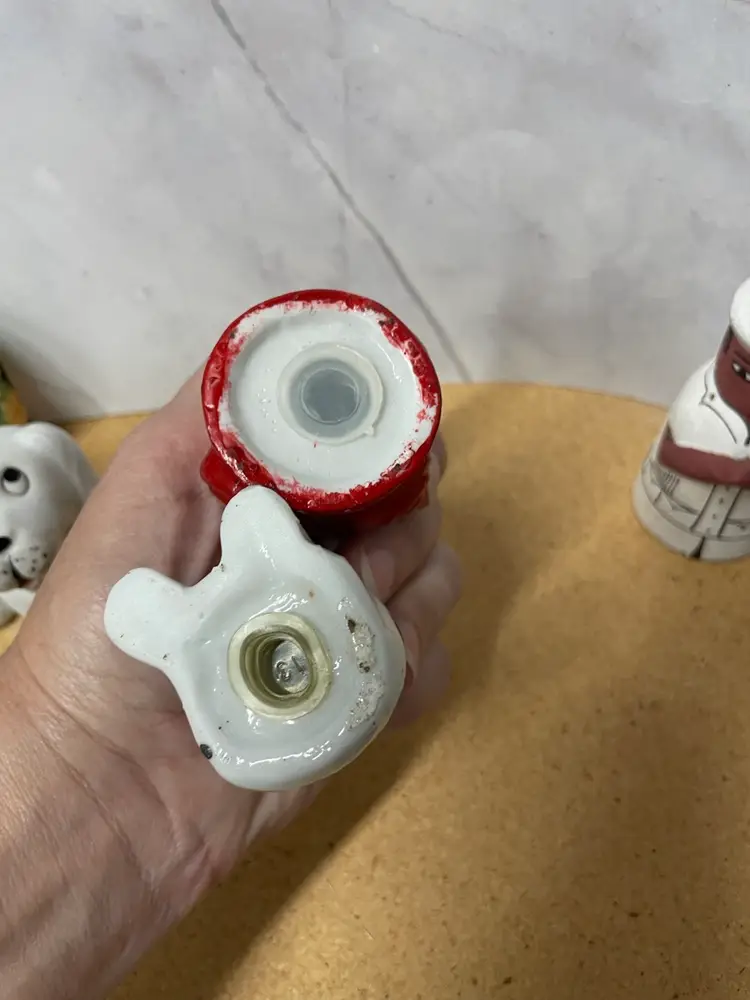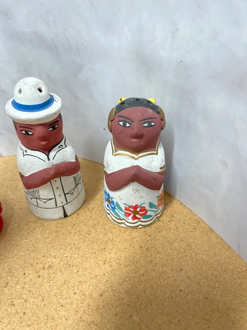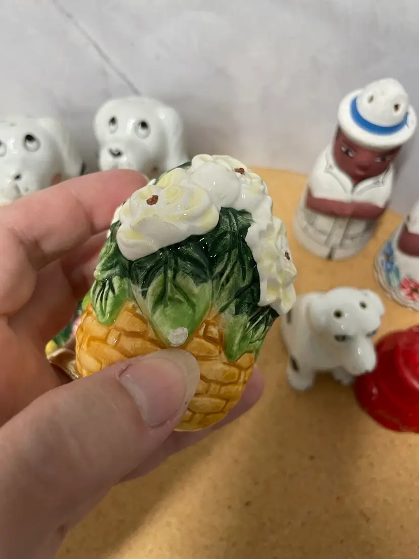 Salt and pepper shakers –Lot of 4 sets. Dalmatian and fire hydrant – with stoppers – cold painted with some minor paint wear. Asia master group flower basket shakers – ceramic – white flowers have chip on leaves – see pictures. Black and white cold painted dogs – yellow collar, blue collar – paint wear – with stoppers. Red plate pottery Allen theme couple – her yellow bow has been repaired – no stopper