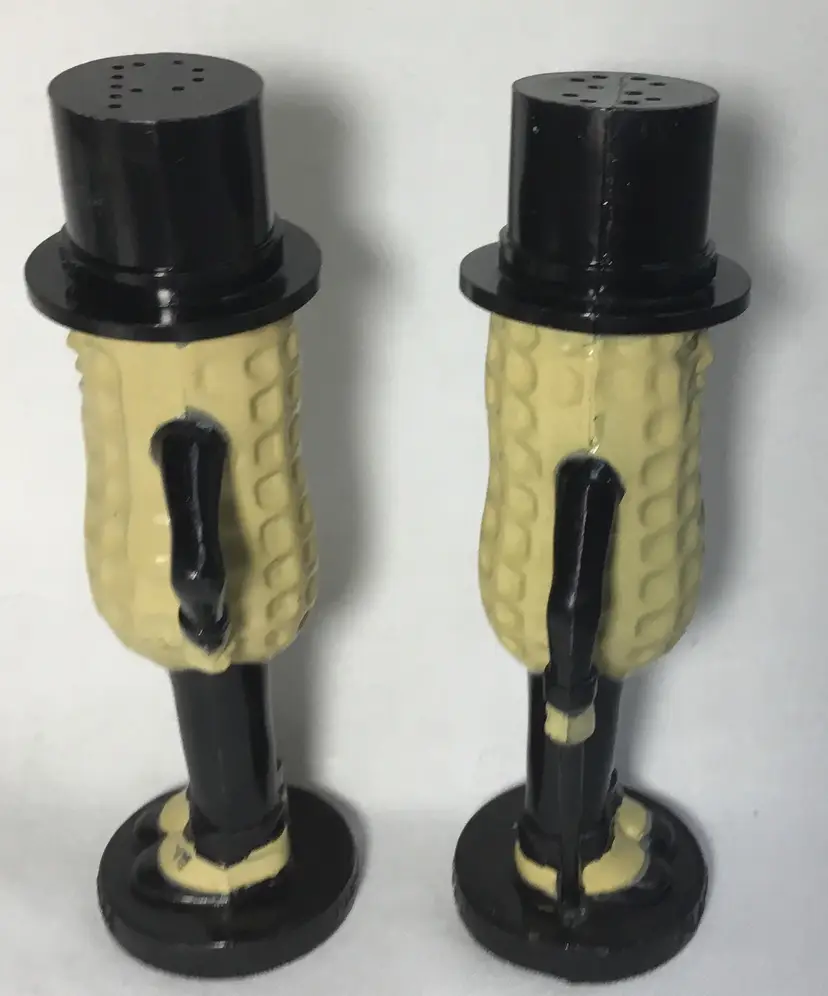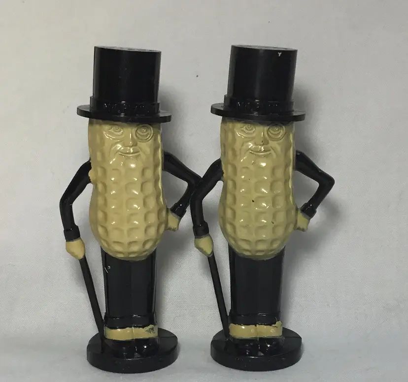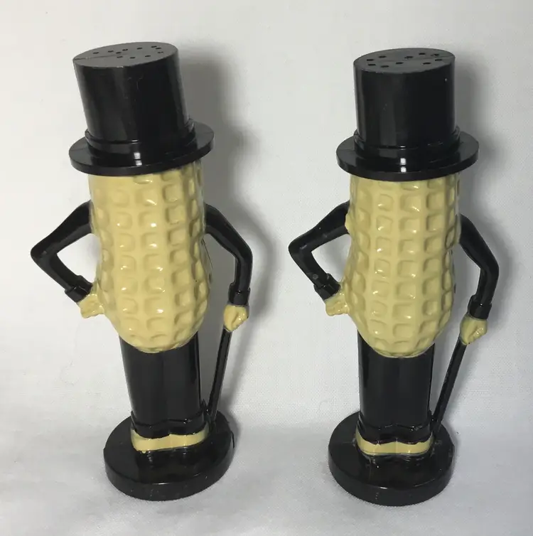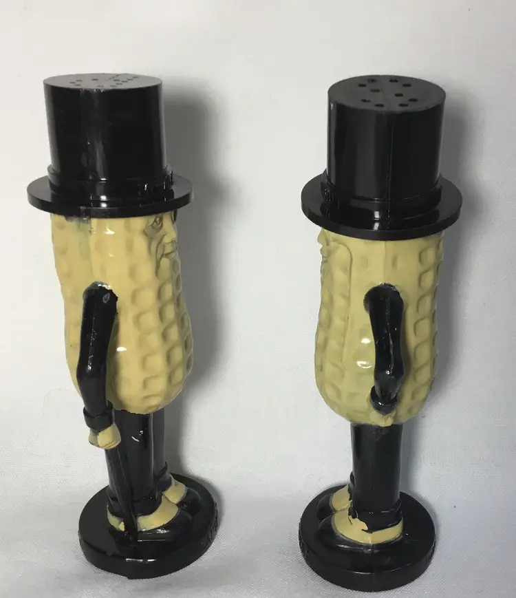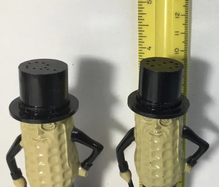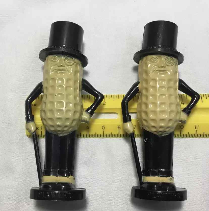 4 inches tall by 2 inches wide elbow to elbow, plastic Planters Mr. Peanut sall & pepper shakers, black plastic with yellowish paint for peanut body, head, gloves & shoes. One shaker has holes in the shape of an "S", other has smaller holes in shape of a "P." Tiny paint chips on front of salt shaker, and feet of pepper shaker. Both have tiny paint chips on hand with cane, and a lighter coating of paint under hat brim. Both say "Mr. Peanut" on the hat band and "Planters" on the round base.