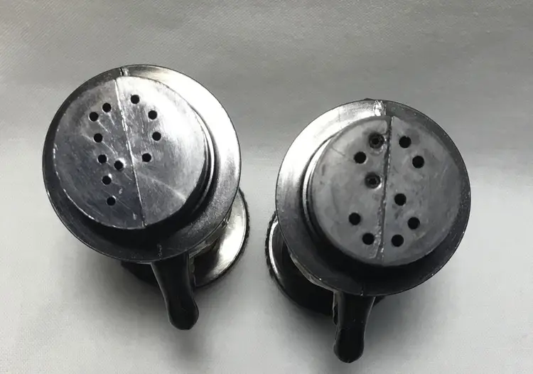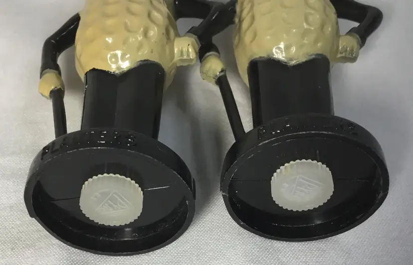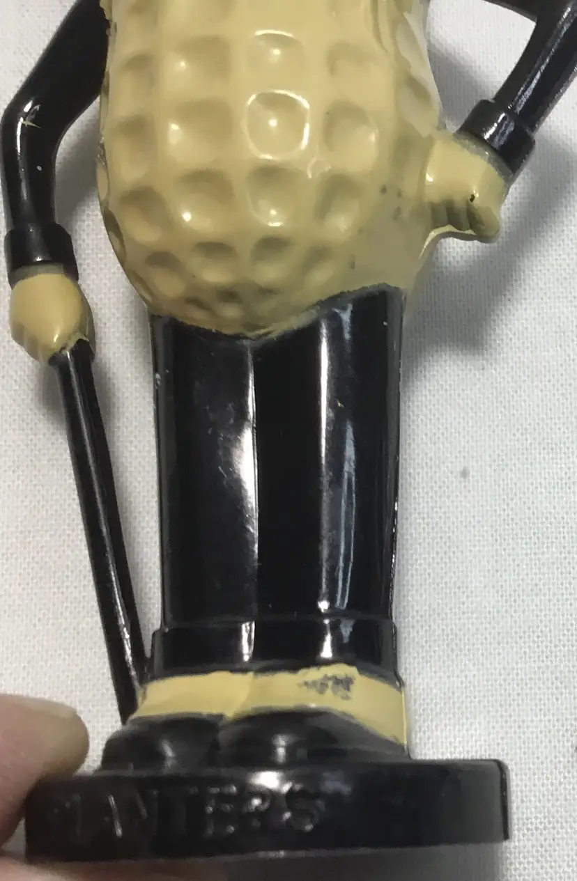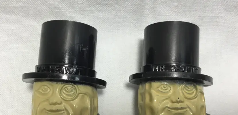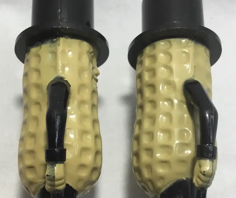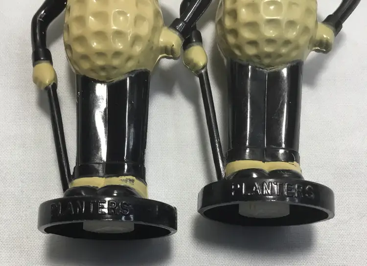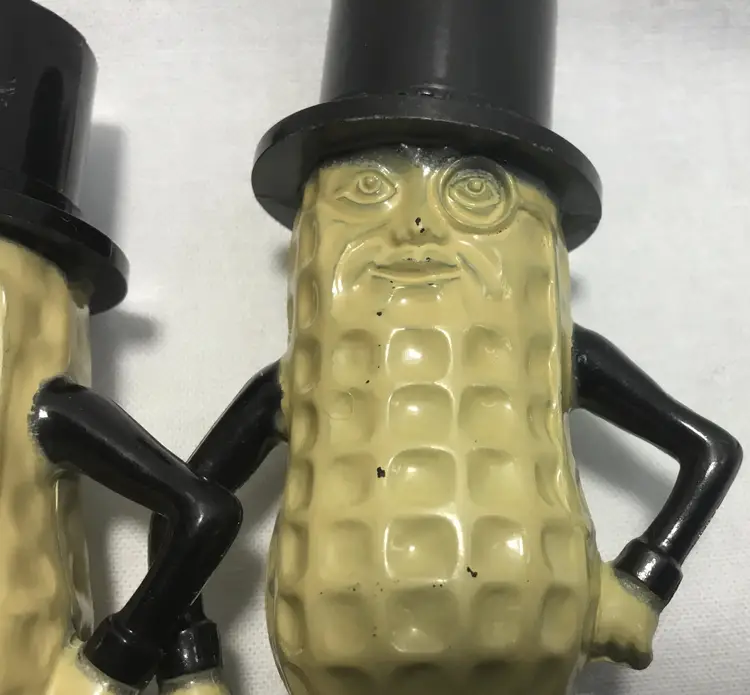 4 inches tall by 2 inches wide elbow to elbow, plastic Planters Mr. Peanut sall & pepper shakers, black plastic with yellowish paint for peanut body, head, gloves & shoes. One shaker has holes in the shape of an "S", other has smaller holes in shape of a "P." Tiny paint chips on front of salt shaker, and feet of pepper shaker. Both have tiny paint chips on hand with cane, and a lighter coating of paint under hat brim. Both say "Mr. Peanut" on the hat band and "Planters" on the round base.