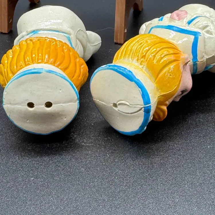 Vintage Hand Painted Salt and Pepper Shakers Sailors Girl Boy Plastic Uniform on Bench Stand 64 grams In nice preowned vintage conditon