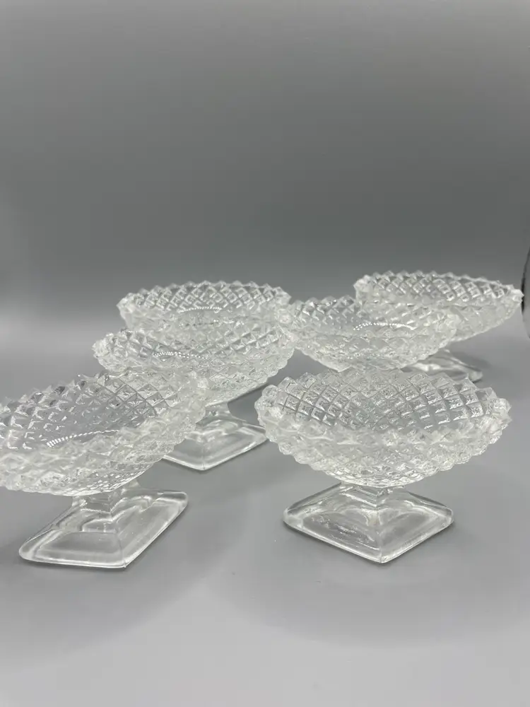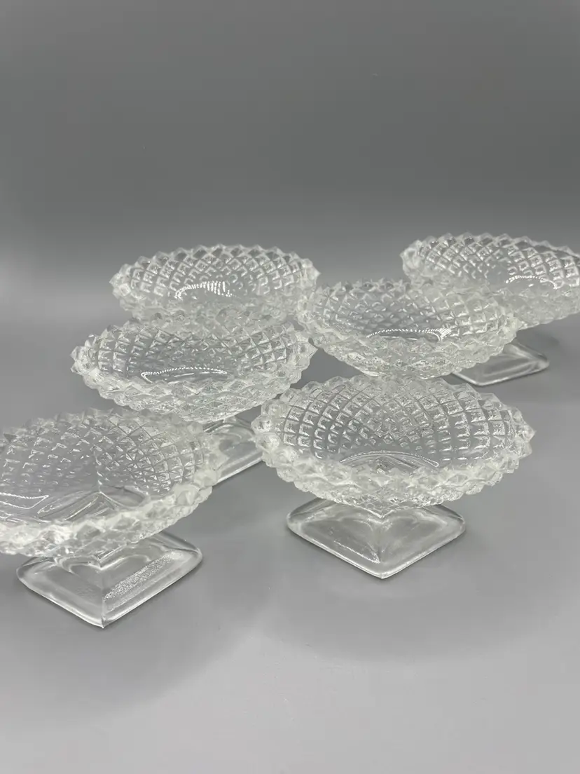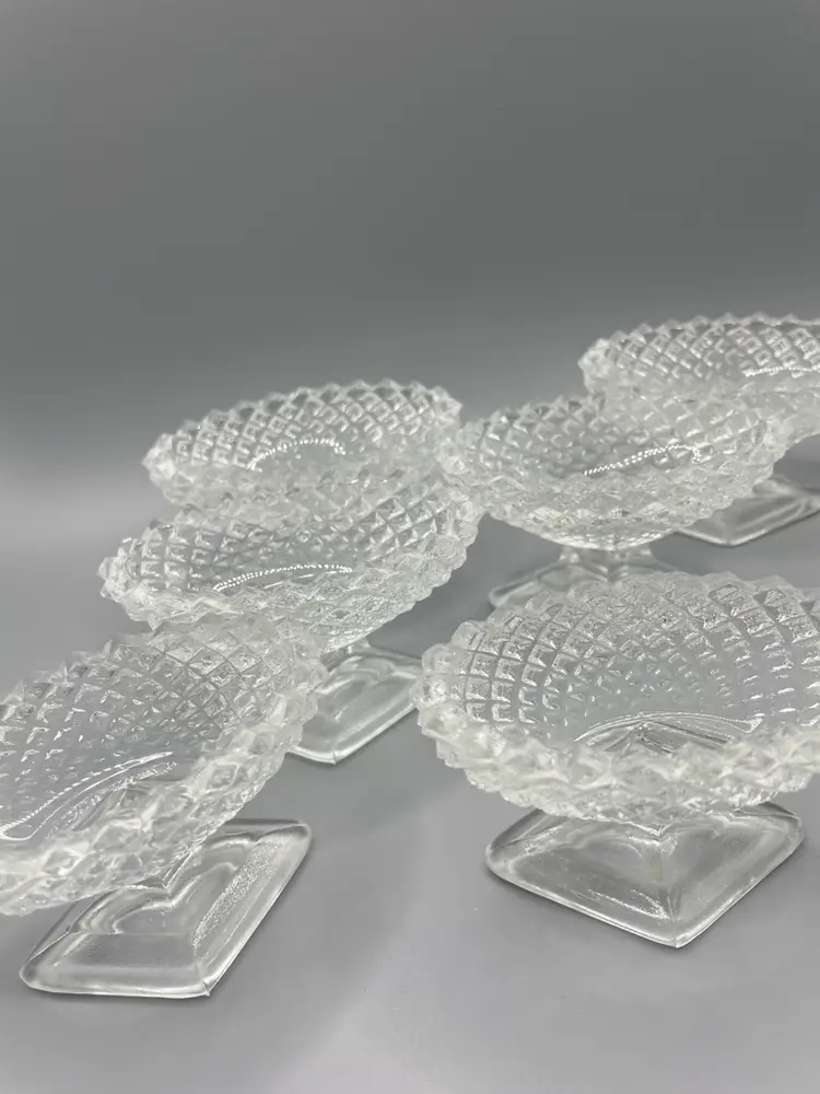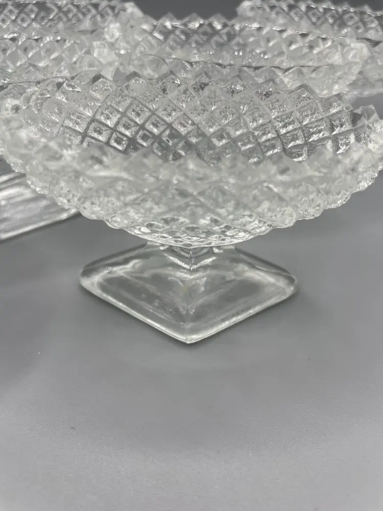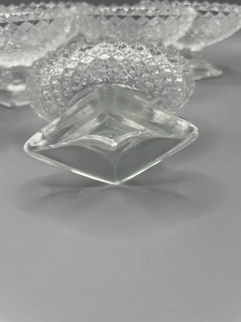 These pretty little salt cellars feature diamond pattern with a diamond base. Cut glass