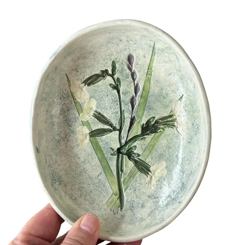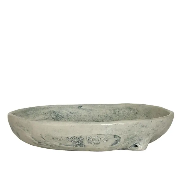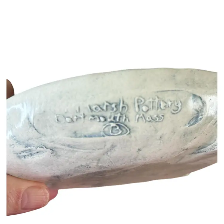 This beautiful Salt Marsh Pottery bowl measures approximately 6 3/8" L x 5 1/4" W x 1 3/8" H. It can be hung on the wall or used as a bowl or trinket dish. It is marked Salt Marsh Pottery on the back as well as the initials SLB and signed Campton, I believe. It is in wonderful condition with no chips or cracks. Please see photos and feel free to contact me with any questions. Thank you.