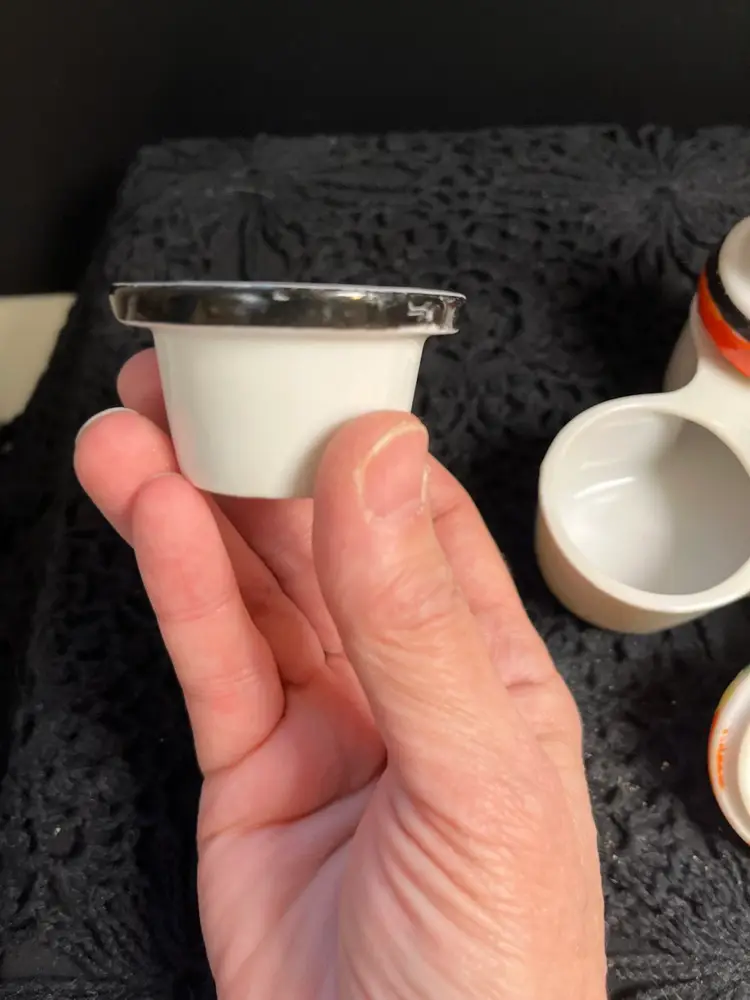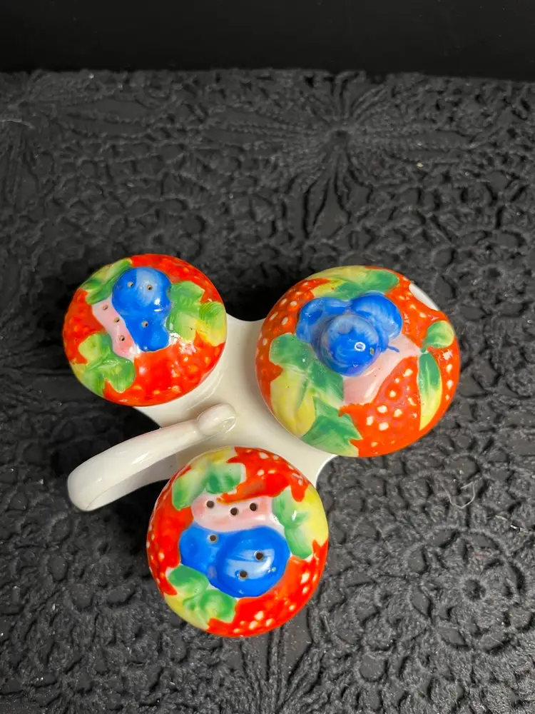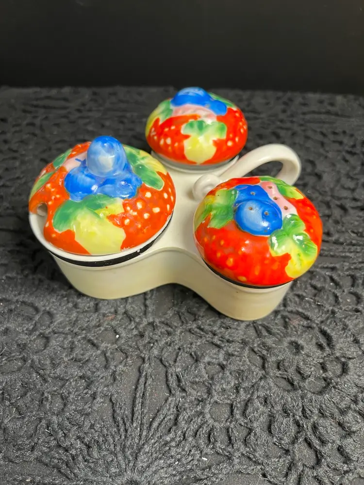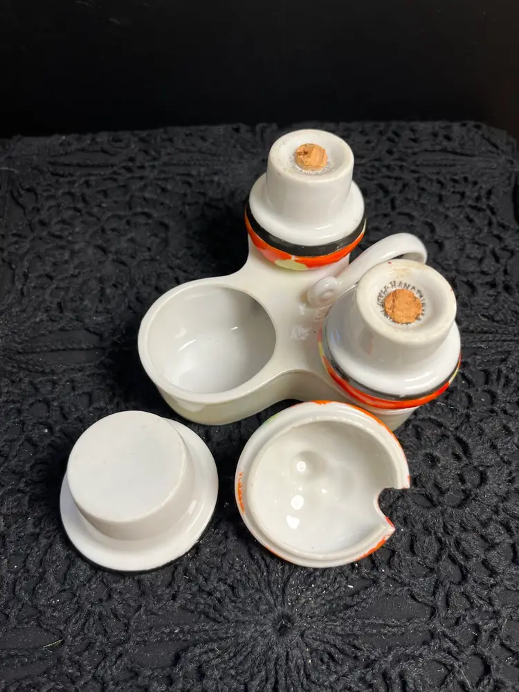 No chips or cracks. I'm unable to make out where it was made. Definitely unique. Original corks, however, they are really wedged into the shakers. 2.75" H, 4.5" W, Approx 7.7 Oz. Lot 24
