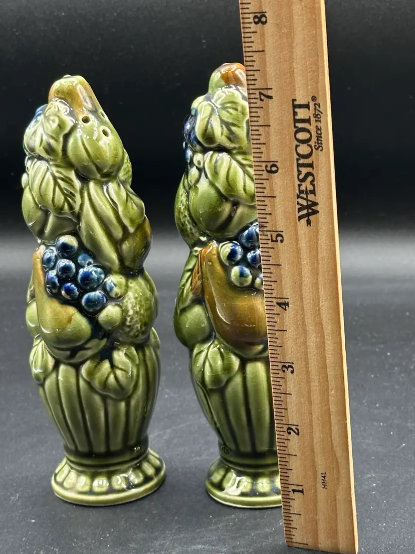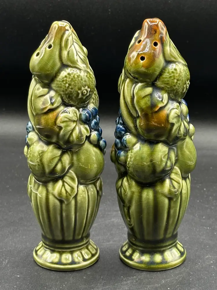 Salt Pepper Shakers-Vintage Japan-Grape Leaf Ceramic Green Blue Figural-Set of 2