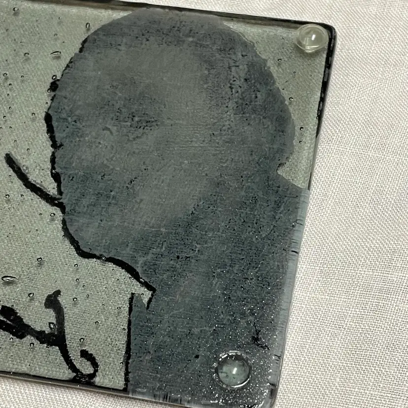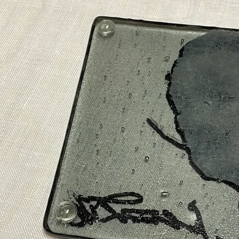 The image was screen printed with black & white enamels onto transparent silver gray glass, and then fused in a kiln. The coaster has clear bumpers on the bottom corners to protect your surfaces.