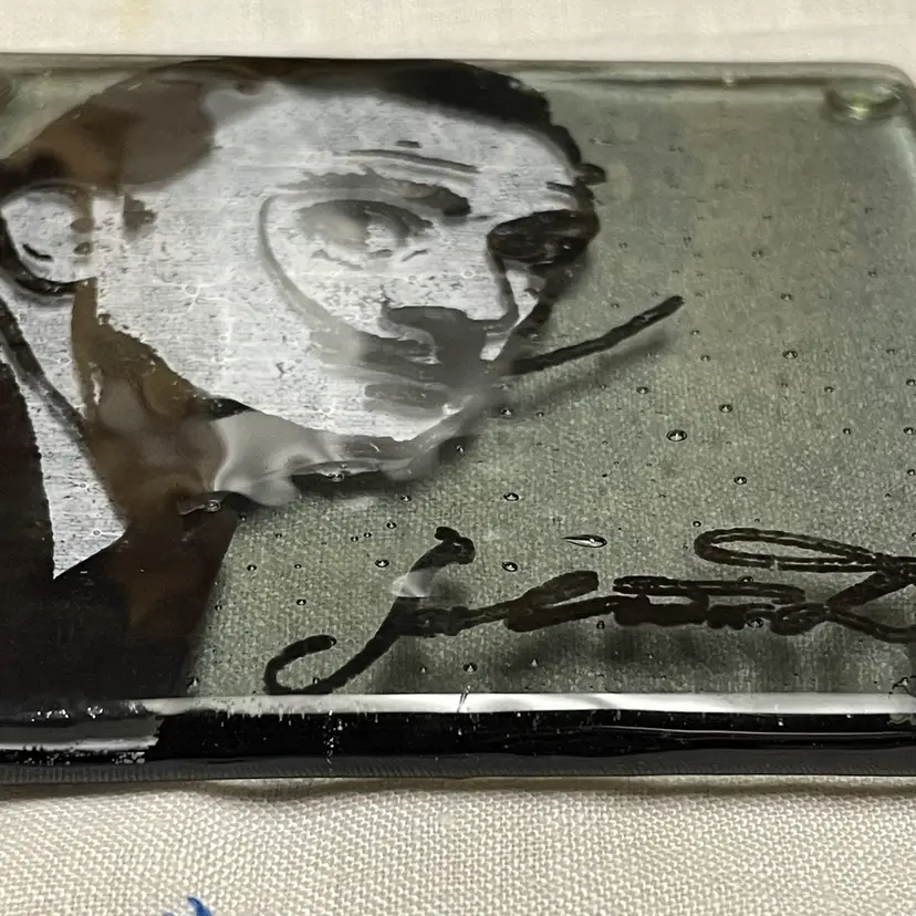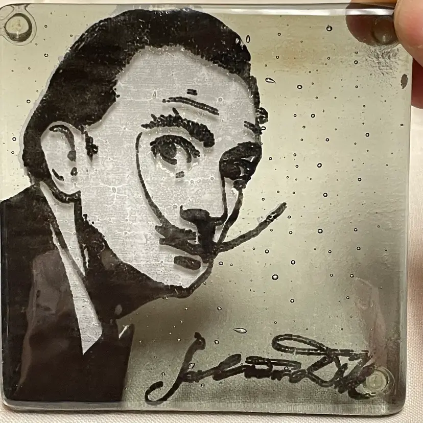 This is a screen printed, kiln formed glass coaster featuring a portrait of artist Salvador Dali and his signature. It was made by Kiku Handmade.