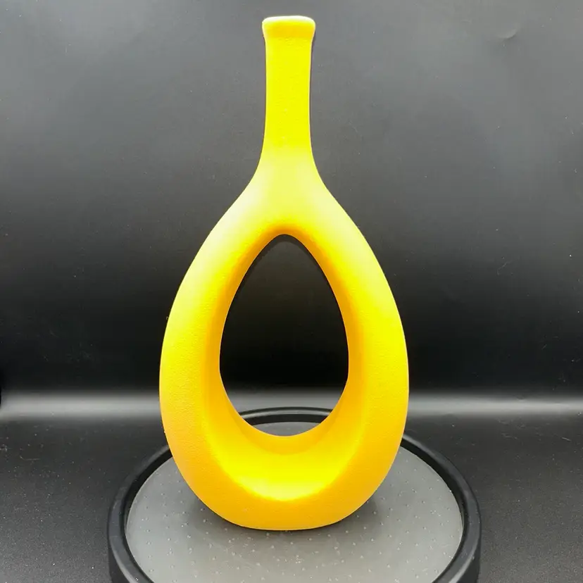 Ceramic with rough surface. Opening is 6.5” tall and 3.5” wide. Excellent condition. MCM.