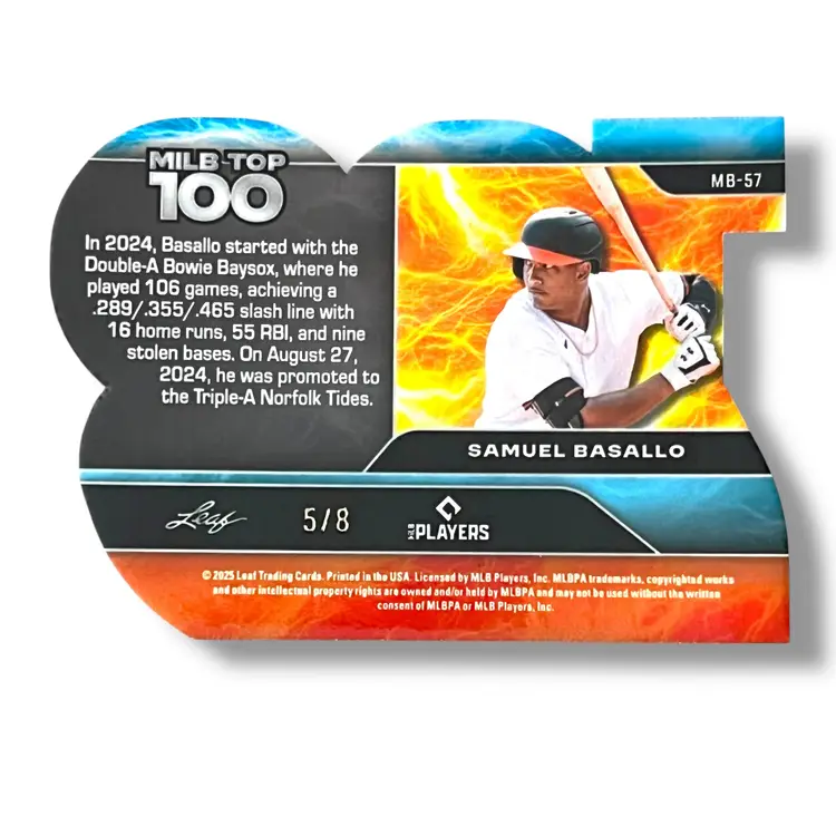 Here We Have a Samuel Basallo 5/8 2025 Leaf Baseball Nation - MiLB Top 100 Purple Refractor