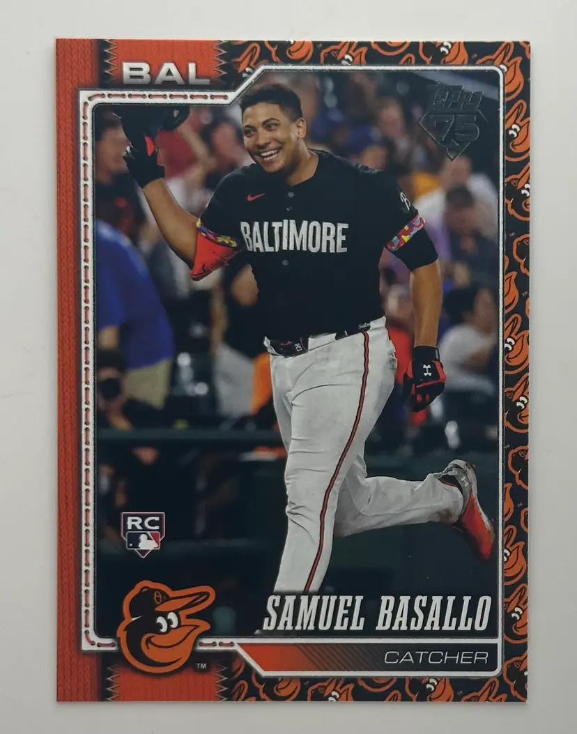 Catch the excitement with this Samuel Basallo rookie card, featuring the Baltimore catcher in action. A must-have for any baseball card collection!