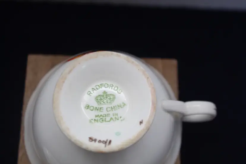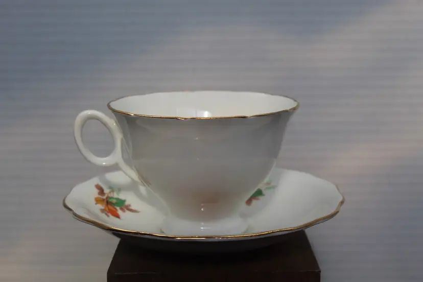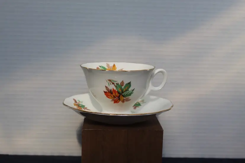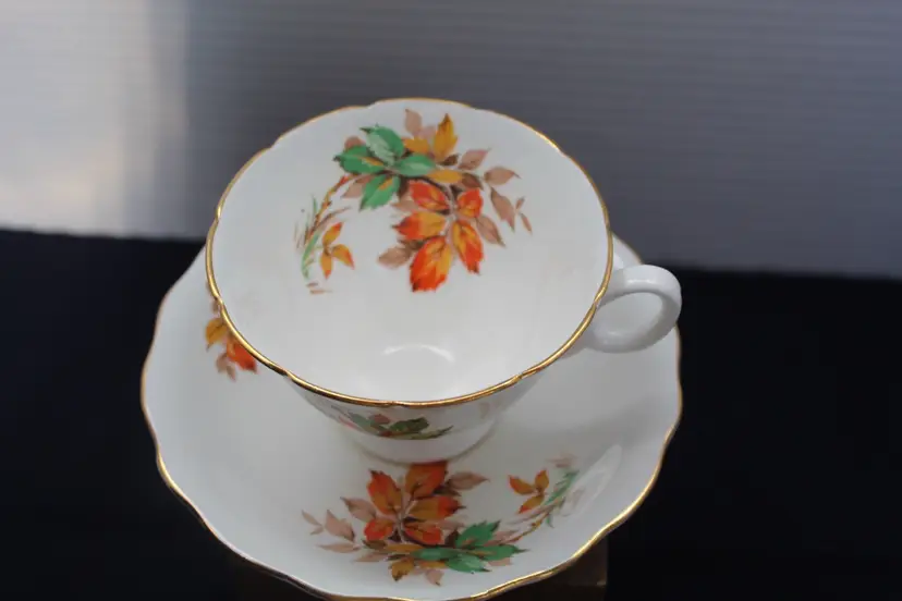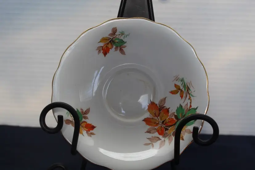 This Samuel Radford tea cup and saucer set is a beautiful addition to any vintage collection. Made of bone china and featuring a vibrant multi color leaves, this set is perfect for those fall tea parties. The set includes one tea cup and saucer, and it was made in the United Kingdom during the 1940s. The antique style of this set is perfect for those who love the elegance of the past.