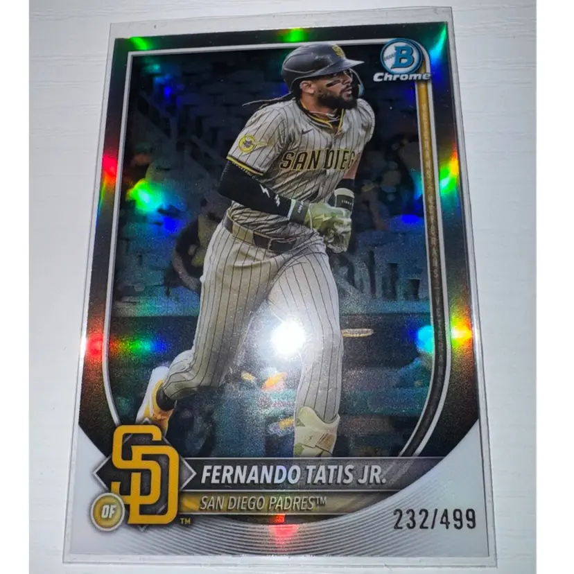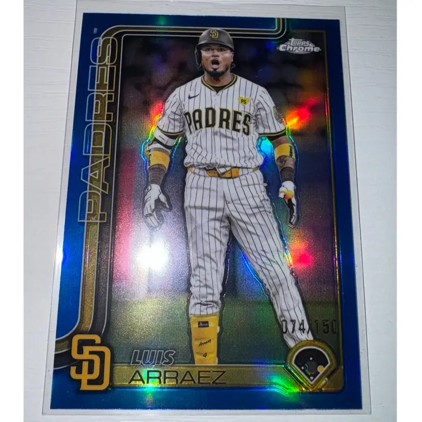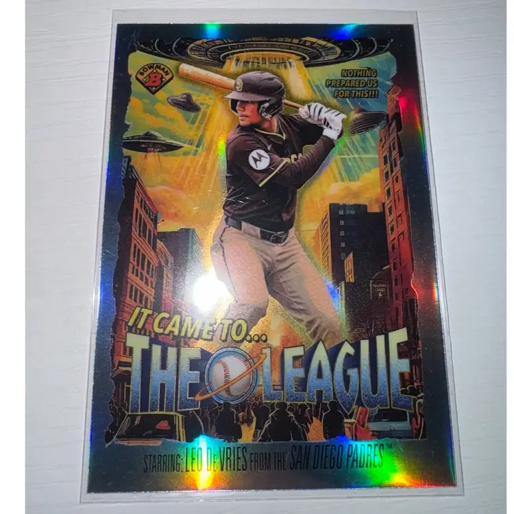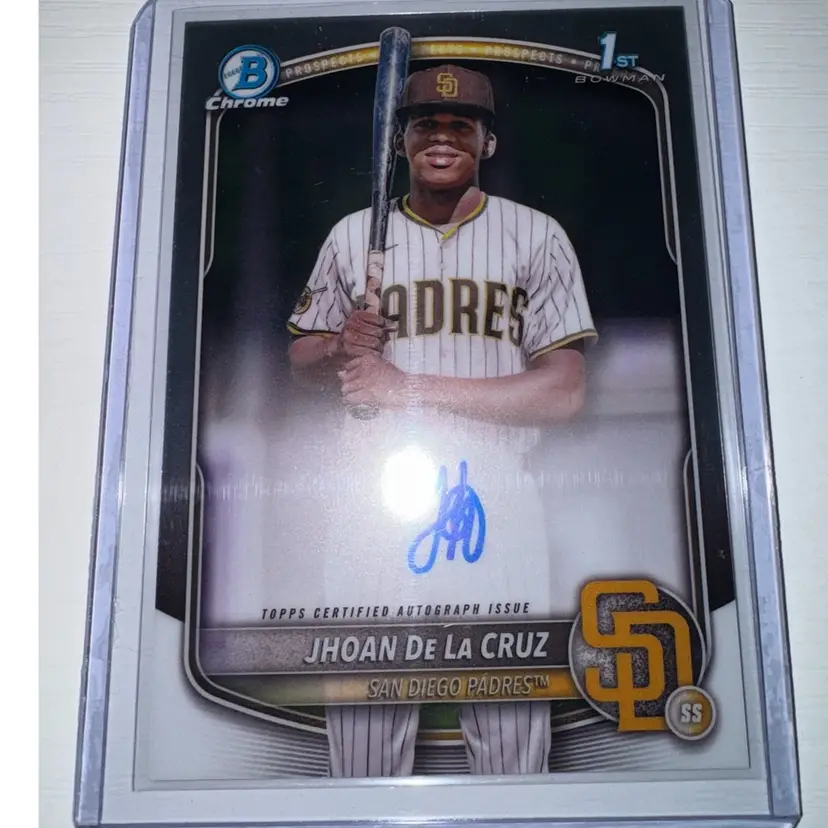 This 5 card lot includes: Jhoan De La Cruz 2025 Bowman 1st Auto Luis Arraez 2025 Topps Blue Holo /150 Fernando Tatis Jr 2025 Bowman Holo /499 Jackson Merrill 2024 Topps holo Leo De Vries 2025 Bowman ICTTL