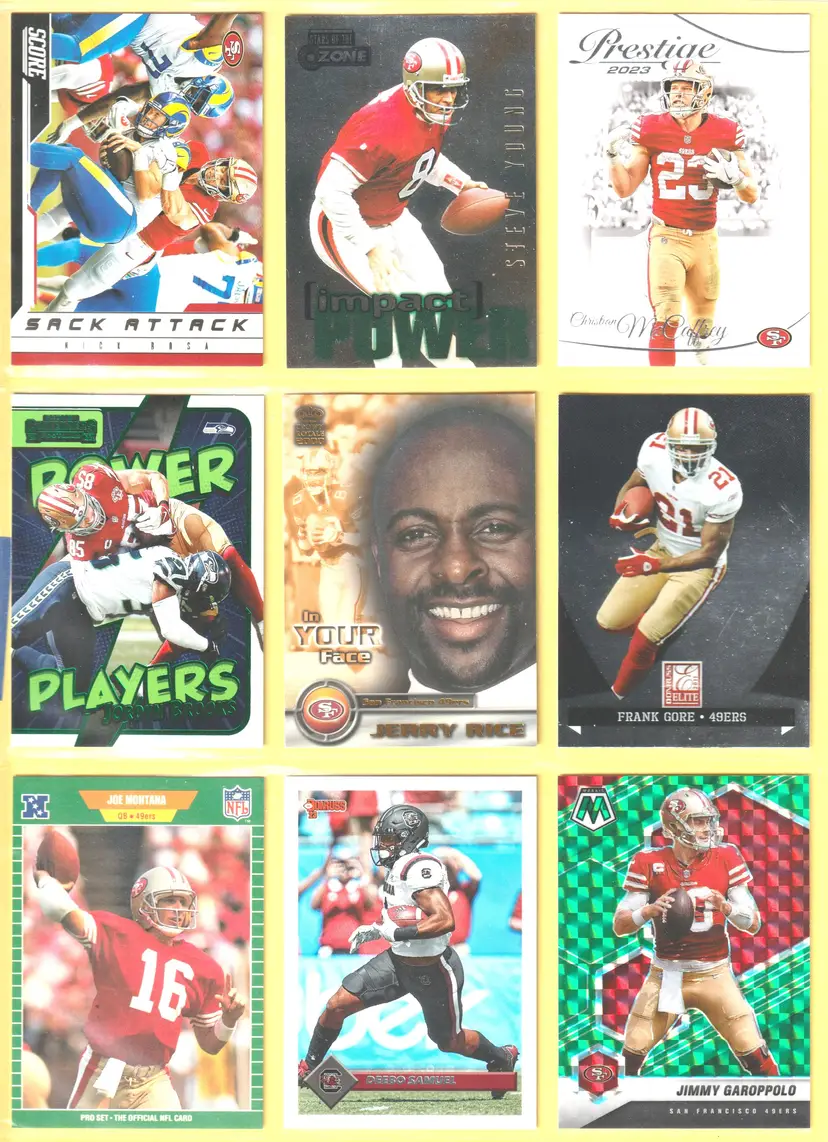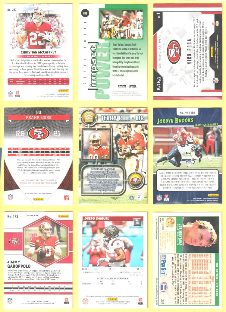 Players: Nick Bosa - Score insert Steve Young - Impact insert Christian McCaffrey - Prestige base Jordyn Brooks - Contenders green insert Jerry Rice - Crown Royale insert Frank Gore - Elite base Joe Montana - Pro Set base Deebo Samuel - Chronicles Draft insert Jimmy Garoppolo - Mosaic parallel