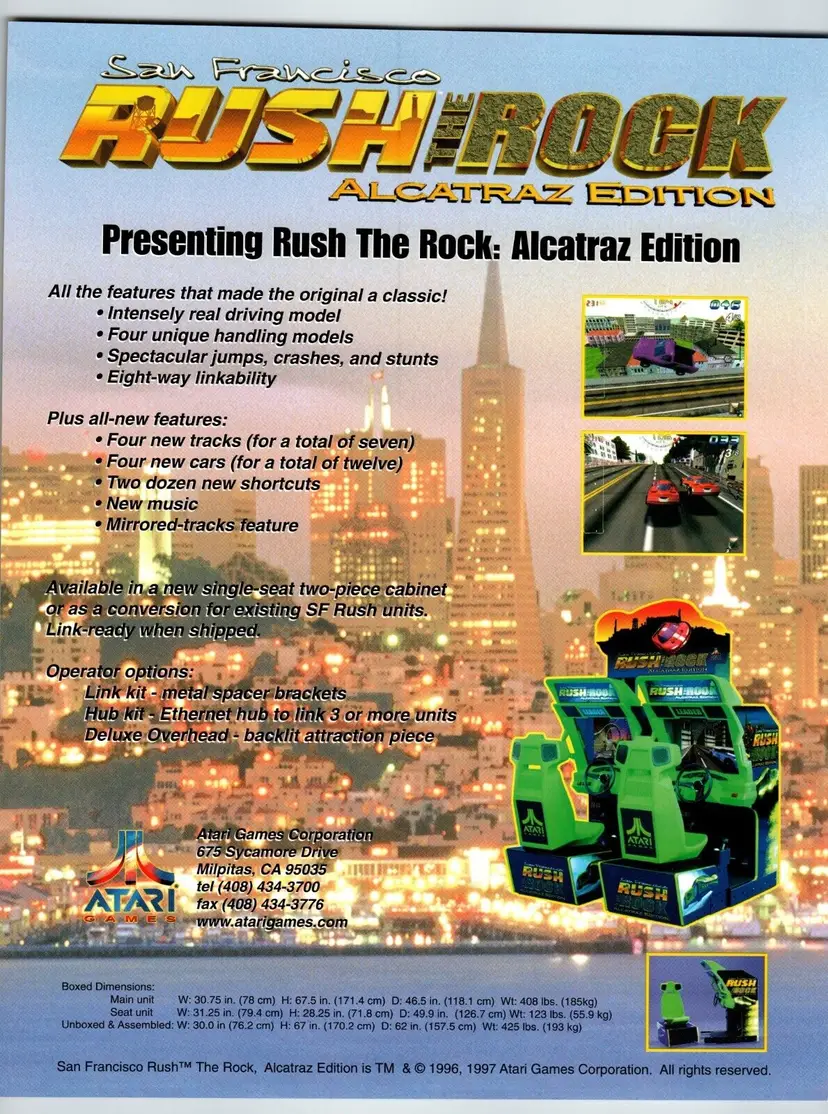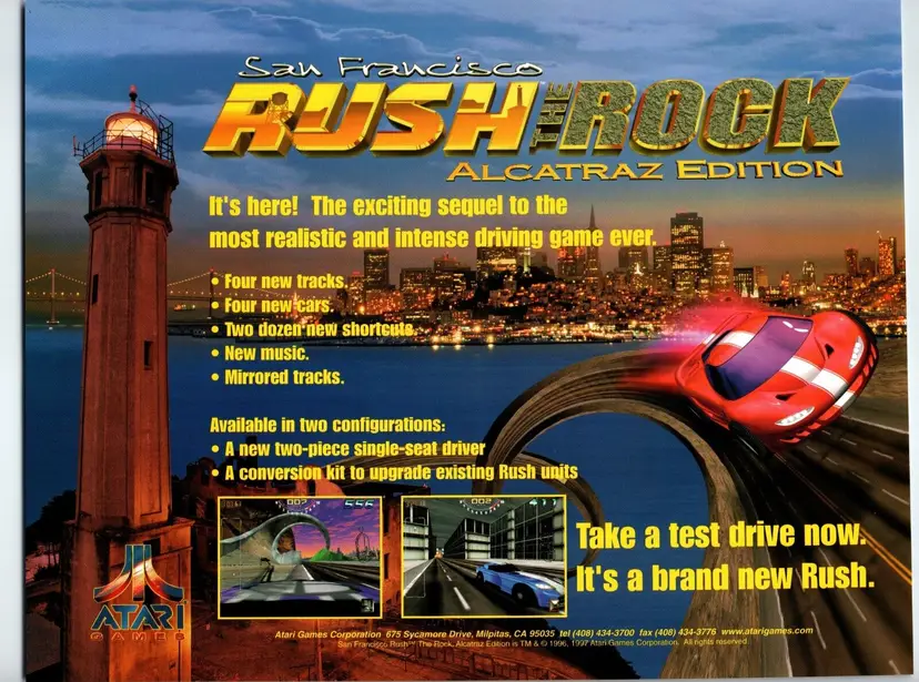 Brand: Atari Year: 1997 Game Title: San Francisco Rush The Rock Alcatraz Edition Theme: Driving Original/Reproduction: Original Country/Region of Manufacture: United States Modified Item: No Arcade: Flyer