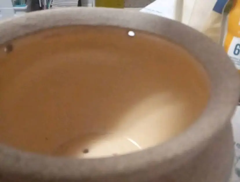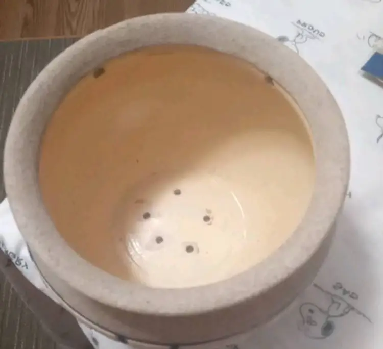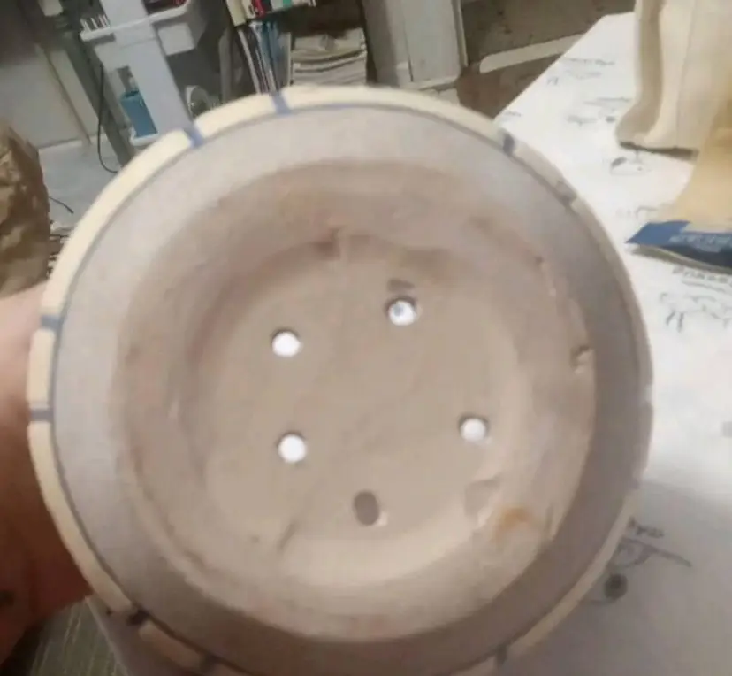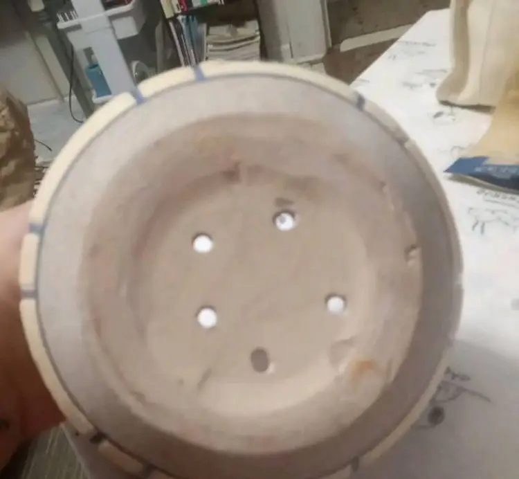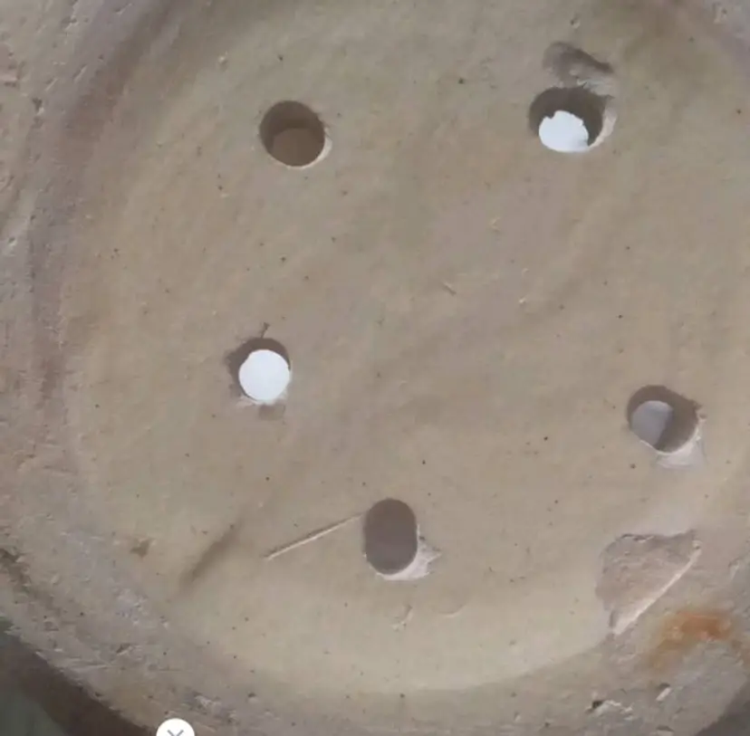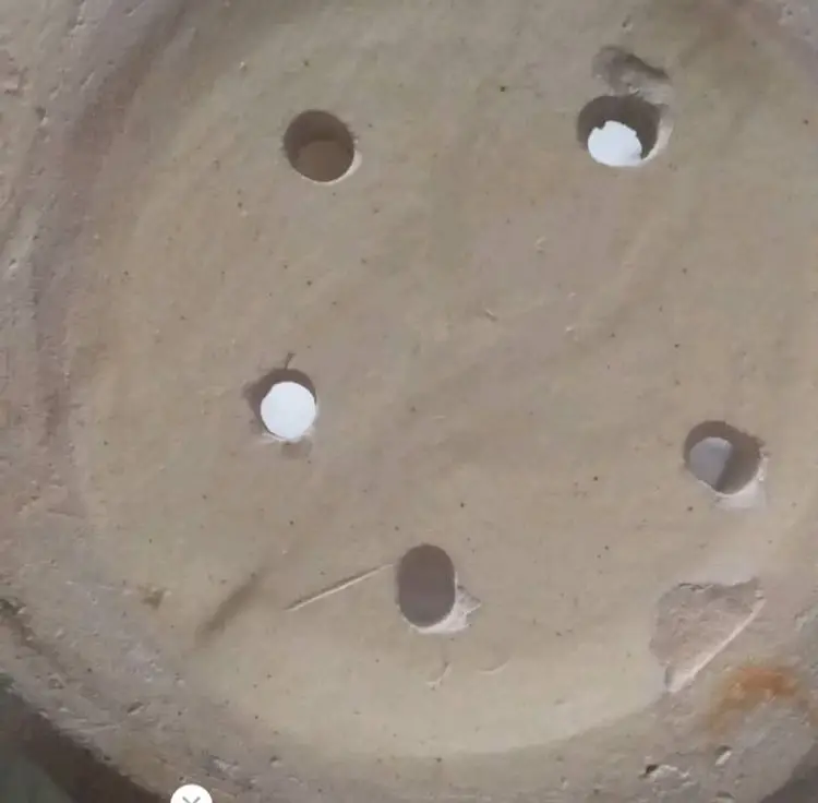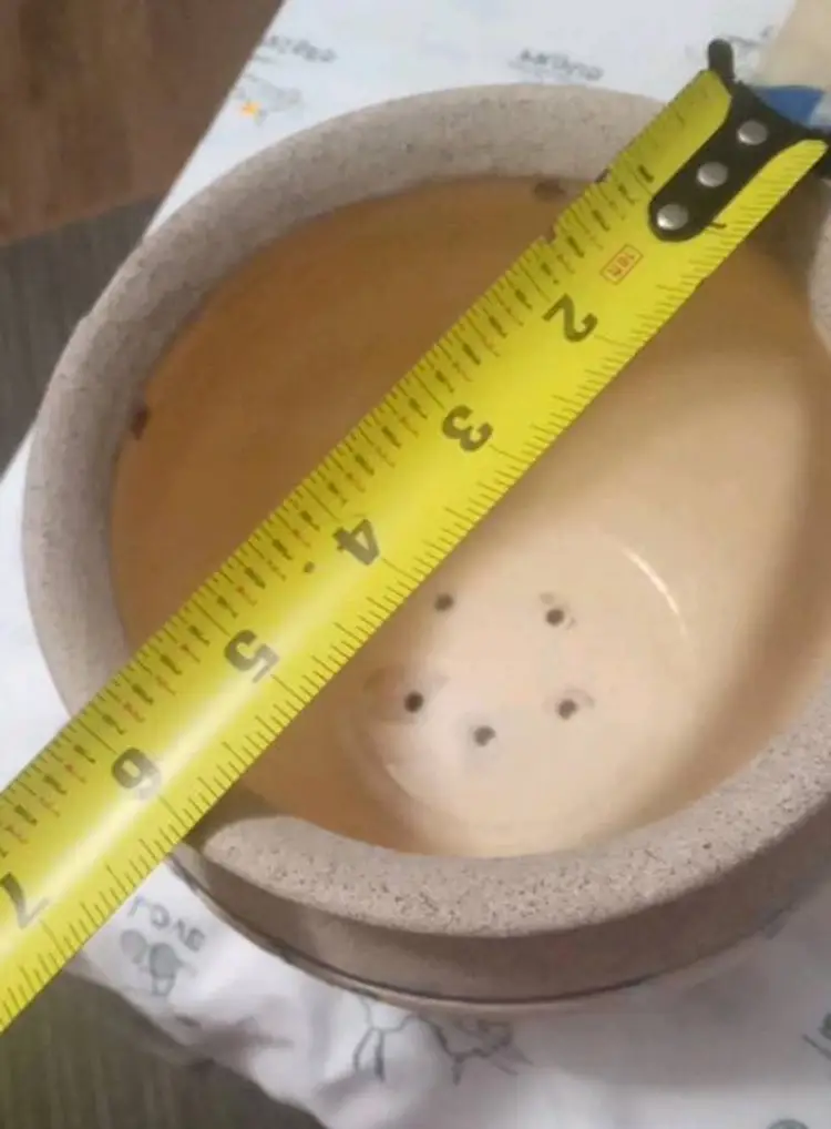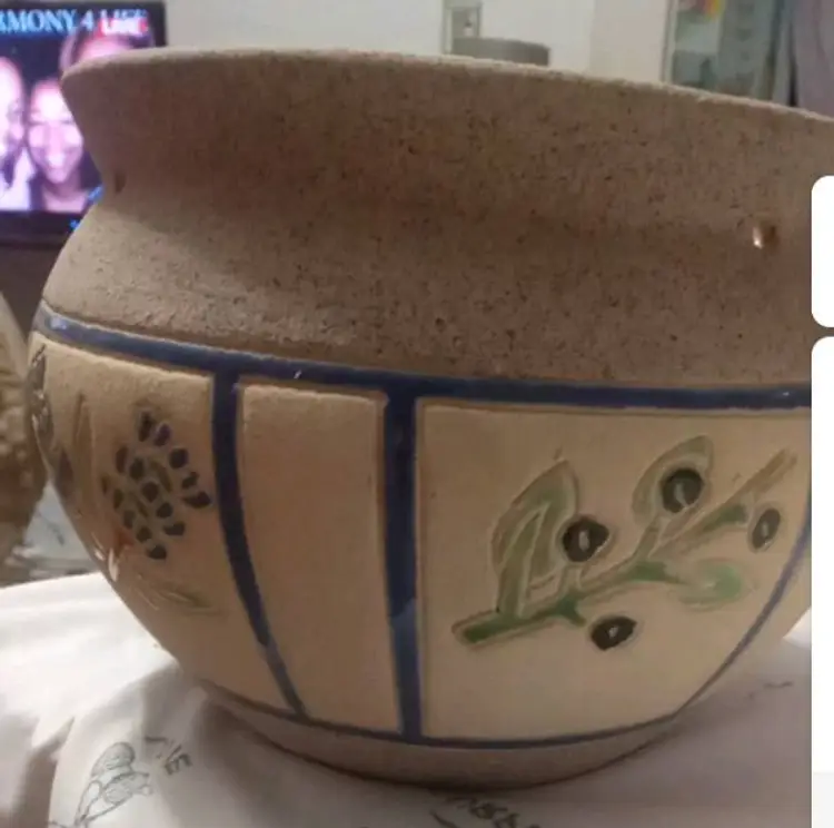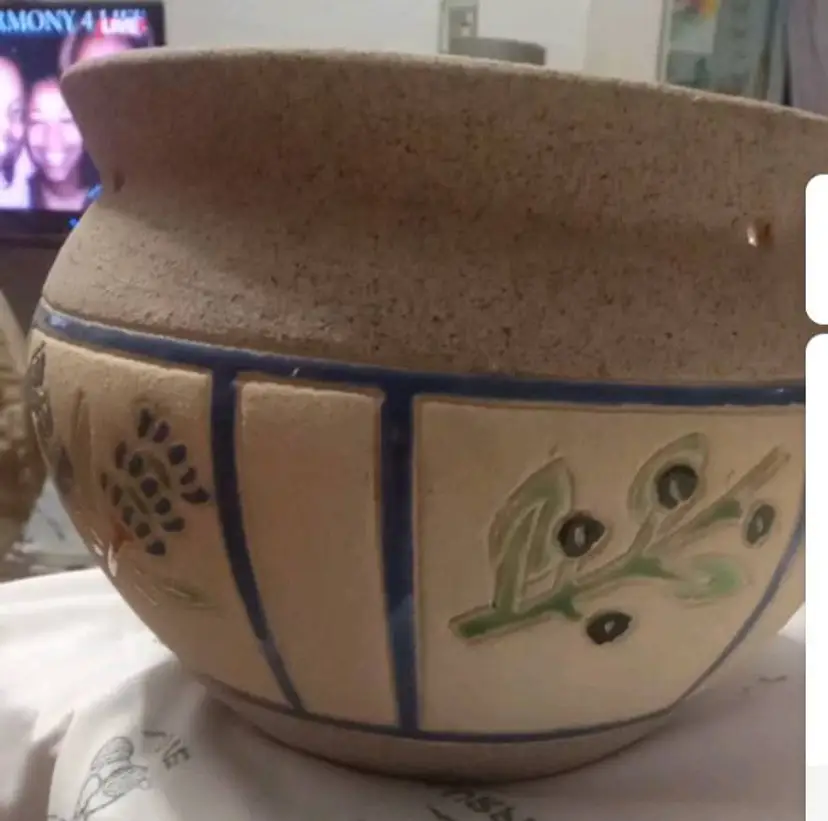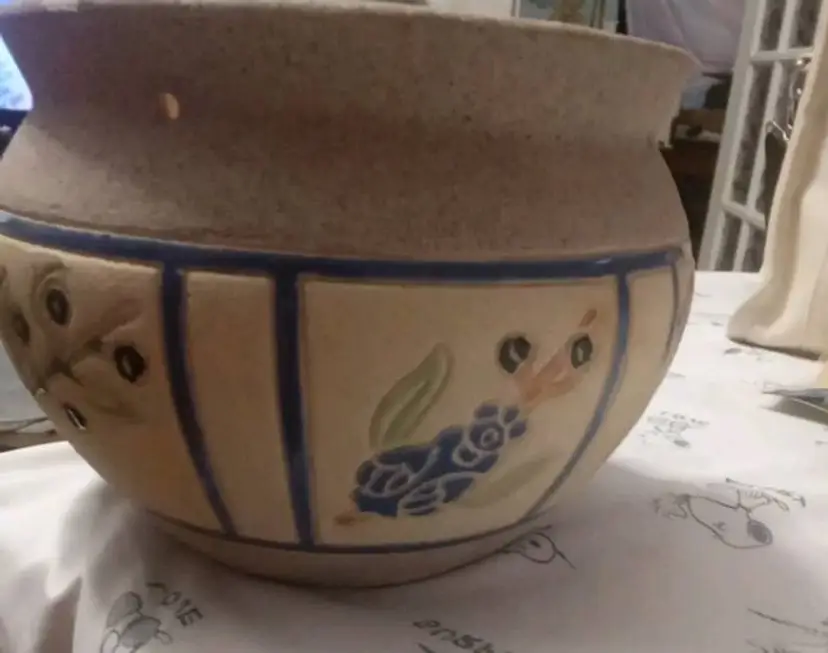 This vintage planting pot is a medium-sized, round flower pot with a sand finish and enameled flowers. It is designed for hanging and is compatible with flower plants. 4.5x6
