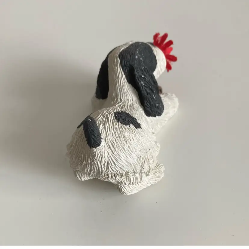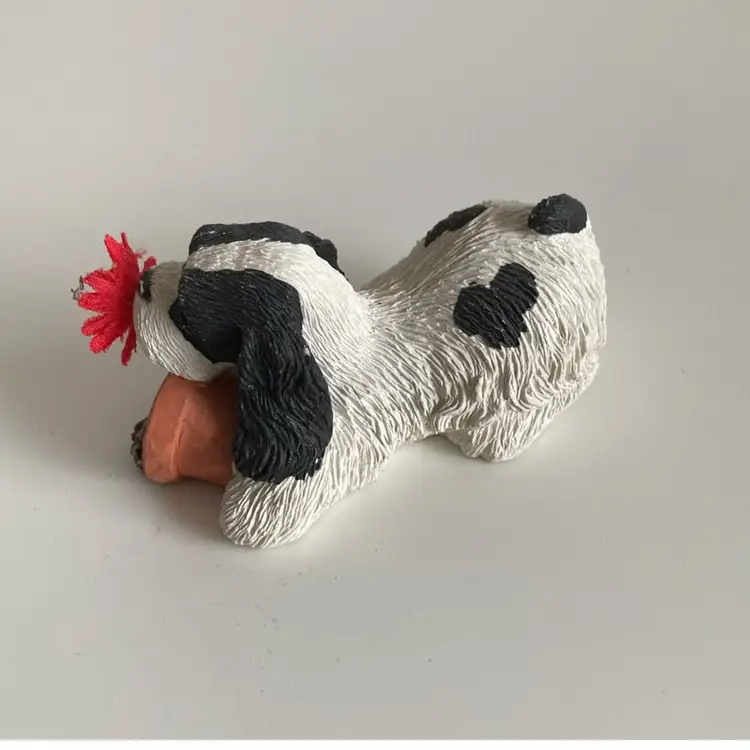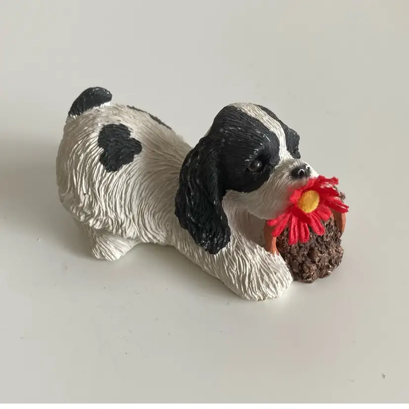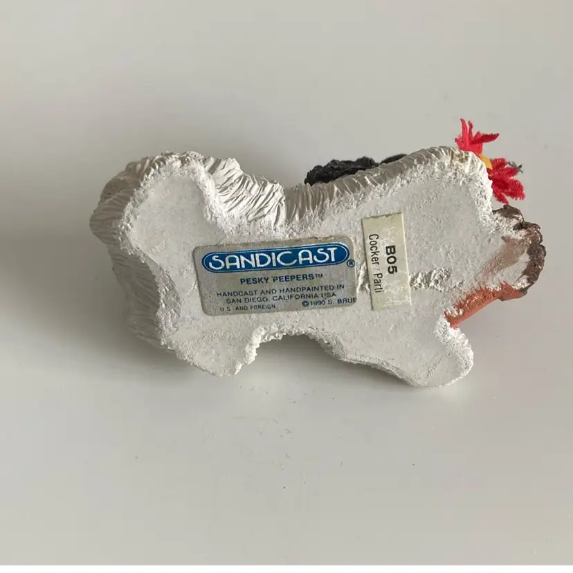 1990 Sandicast Pesky Peepers Cocker Spaniel holding flower pot. B05. This cutie measures 1 3/4” x 2 3/4” x 1 5/8” tall.
