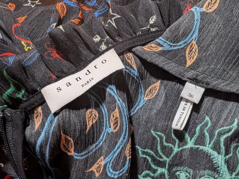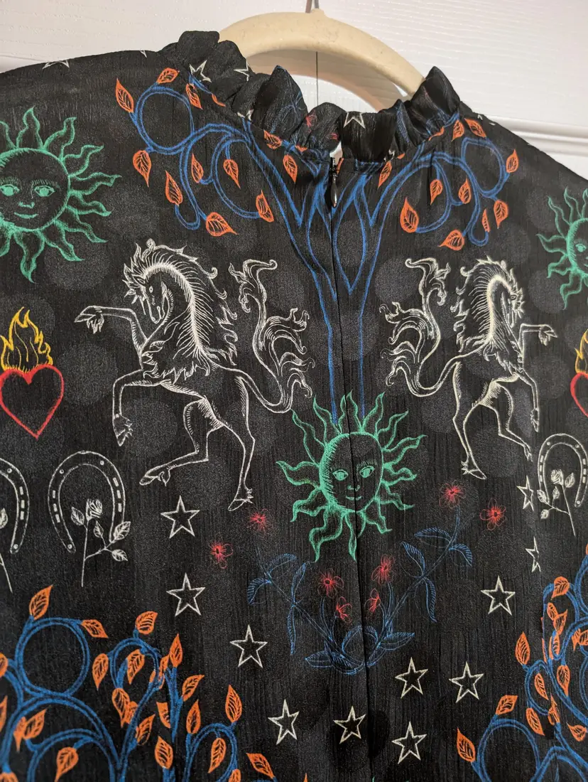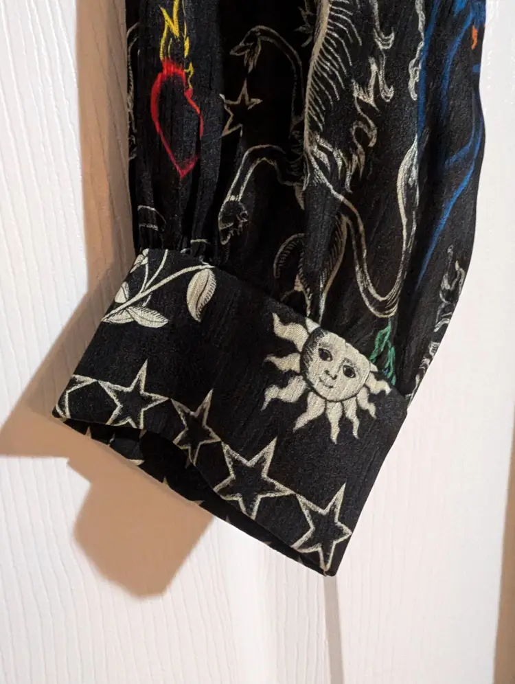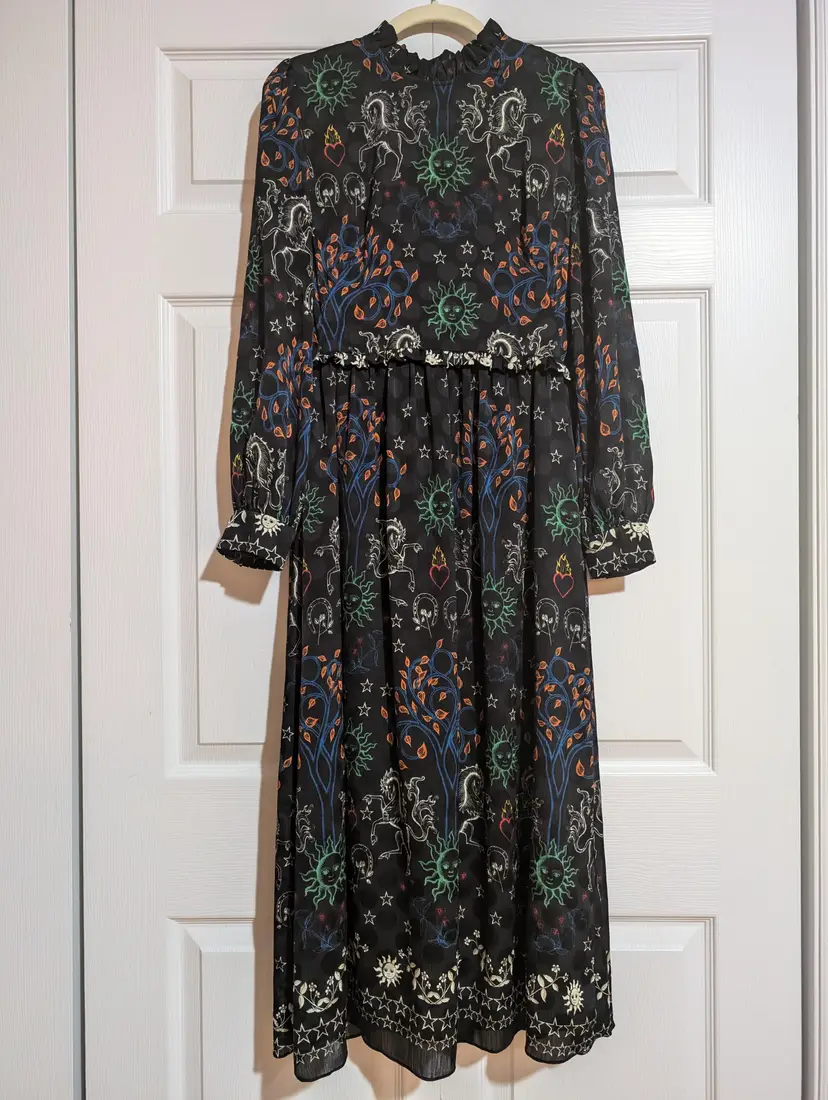 This stunning long sleeve dress is a Sandro Paris from the 2020 fall/winter collection, size 38/US medium. The iconic celestial zodiac print is featured throughout the lightweight (polyester) material.