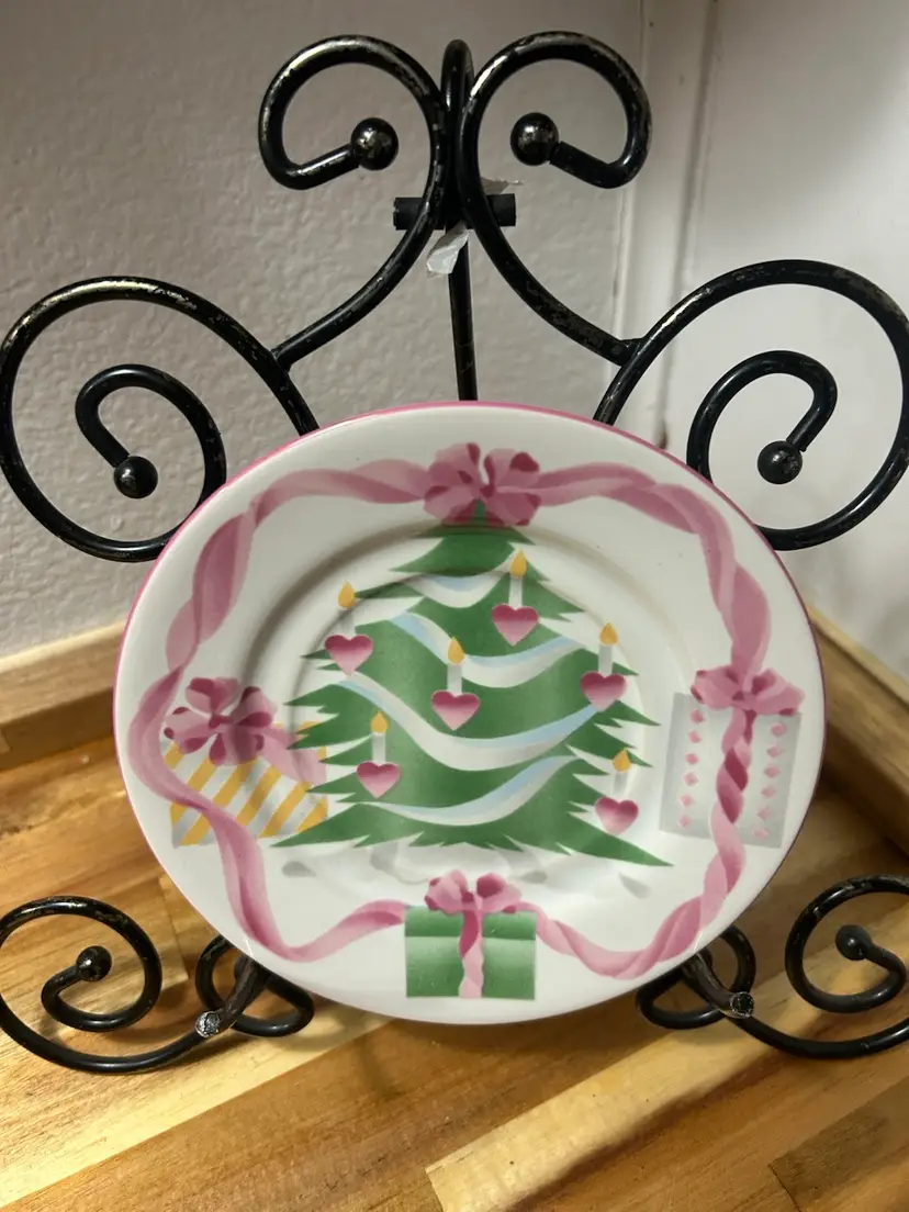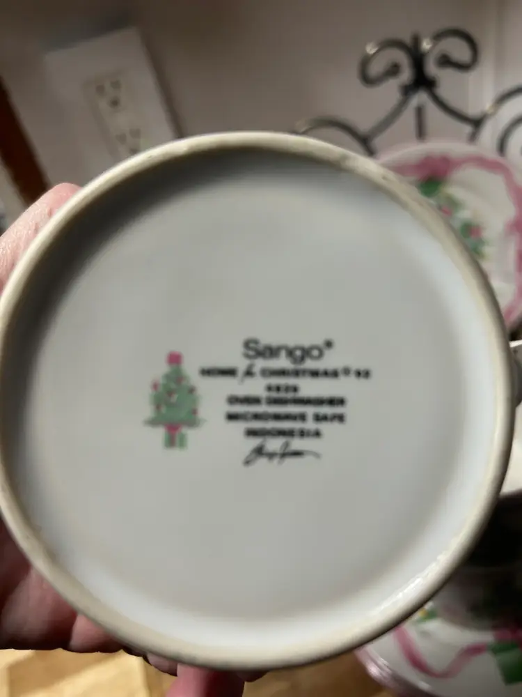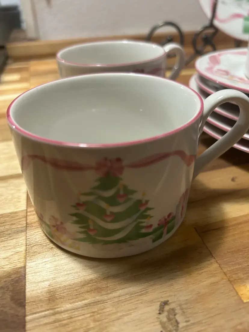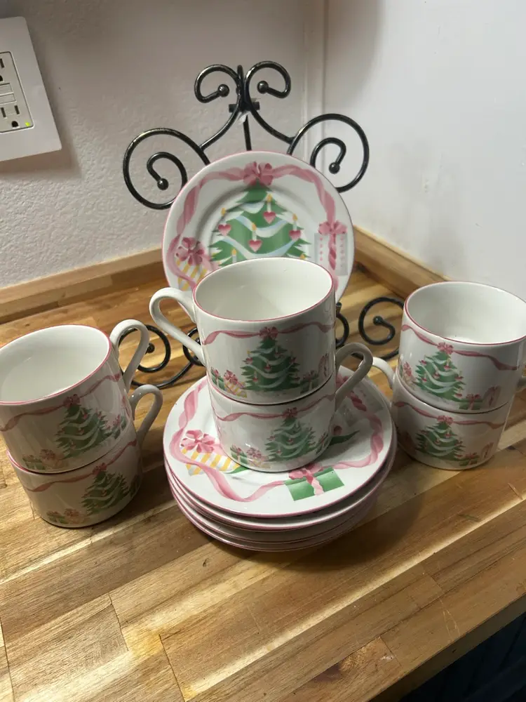 set of 6 Sango "Home for Christmas" cups and saucers. This vintage dinnerware pattern features a white base with a pink ribbon and trim, a Christmas tree with pink hearts and candles, and wrapped presents around the tree.
