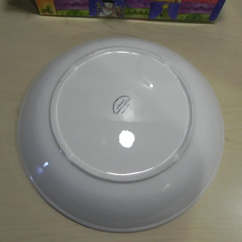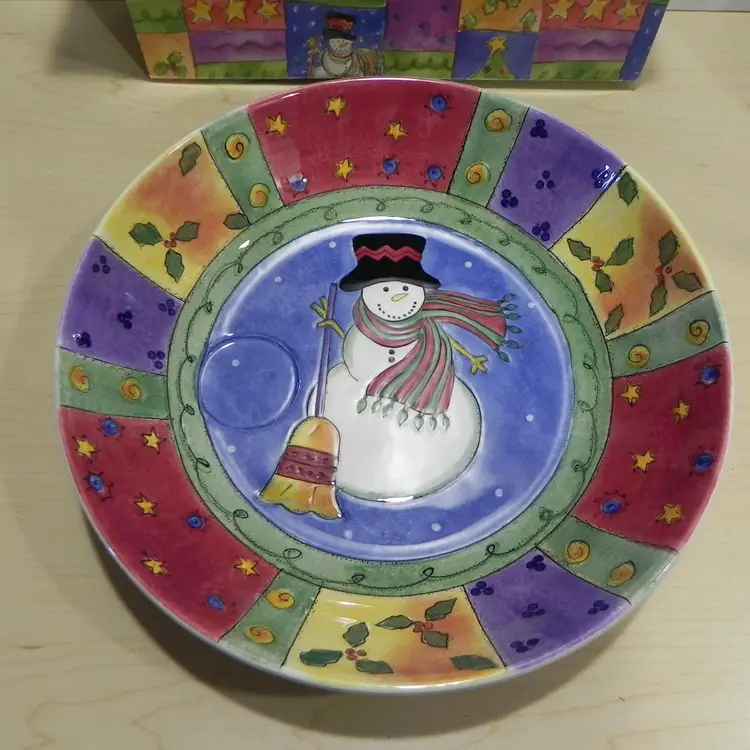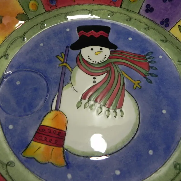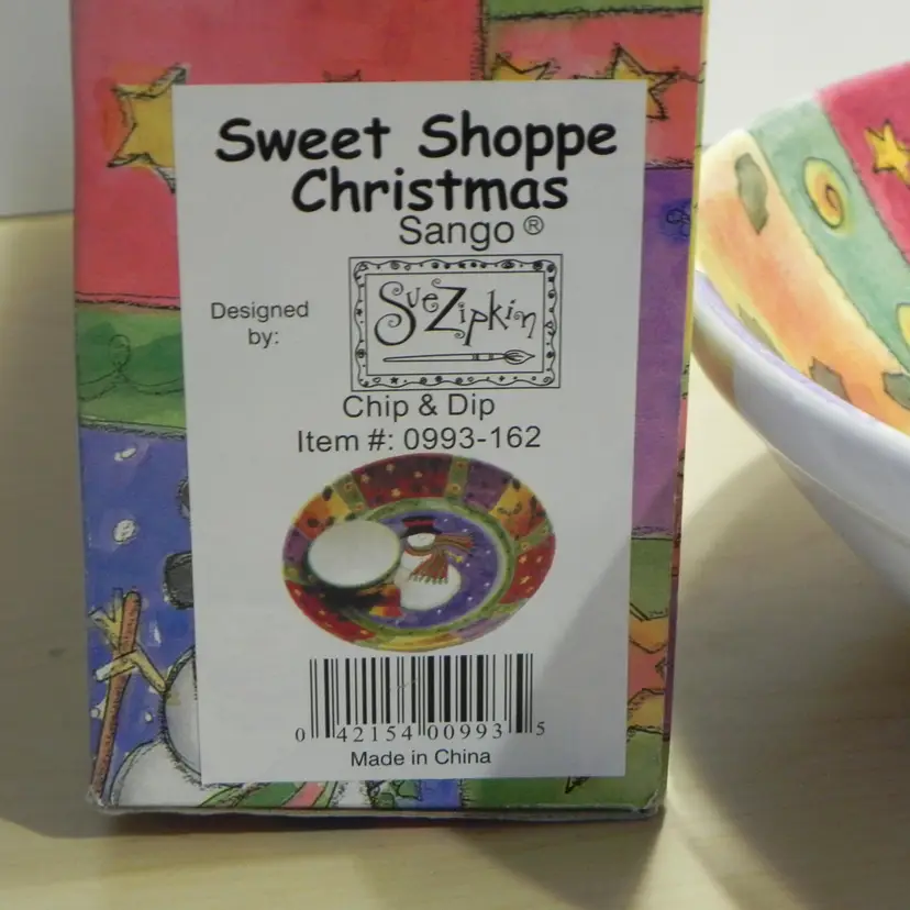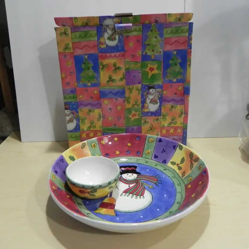 Elevate your holiday gatherings with the charming Sango The Sweet Shoppe Christmas Snowman Chip and Dip Bowl Set, designed by Sue Zipkin. This delightful two-piece set brings a touch of winter whimsy to any table, featuring a playful snowman motif that sets a festive tone for your party. The set includes both a large chip bowl (12.875" diameter x 2.625" deep) and a dip bowl (4.25" diameter x 2.125" deep), perfectly sized for your favorite dips and snacks. Crafted from durable ceramic with a glossy finish, these bowls are both dishwasher and microwave safe, ensuring easy cleanup and versatile use. Whether you're hosting a casual get-together or a winter wedding, this set is an ideal choice for any occasion. The vibrant multicolor pattern, complete with a printed backstamp, adds a contemporary flair to your entertaining ensemble.