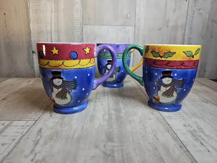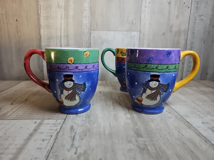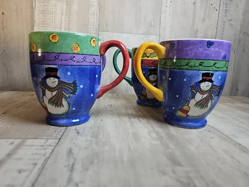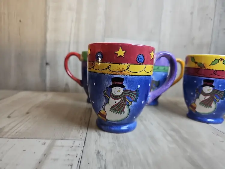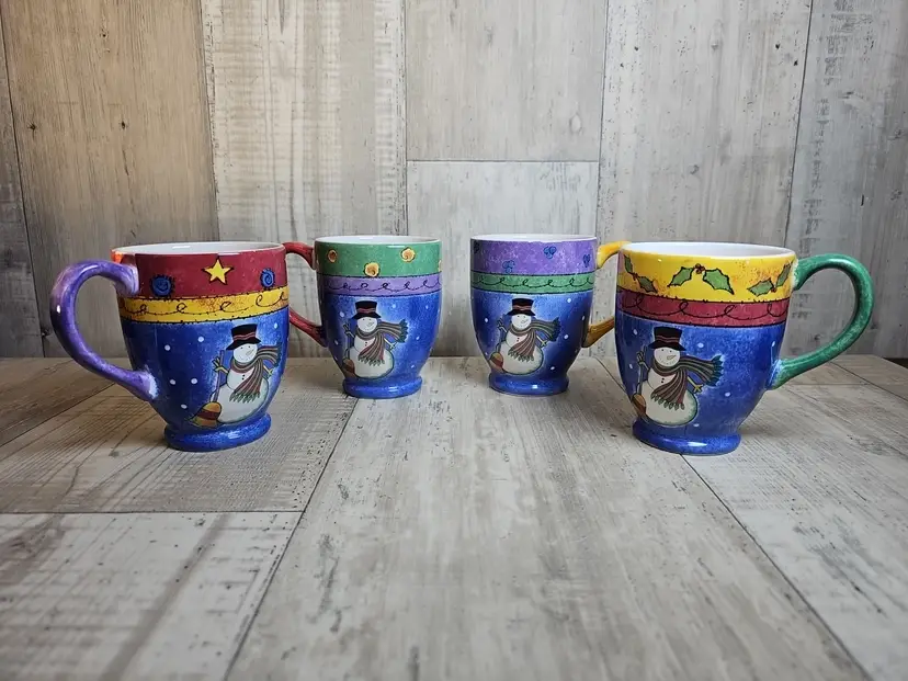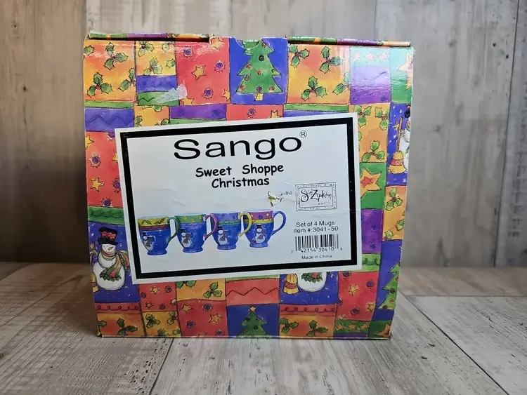 Cheerful Sweet Shoppe Christmas mug quartet by Sango—snowman artwork by Sue Zipkin. Pattern 3041-50, microwave safe. All four mugs are new/unused in the original box; each has a different festive rim color. Great gift or easy upgrade for your holiday coffee station.