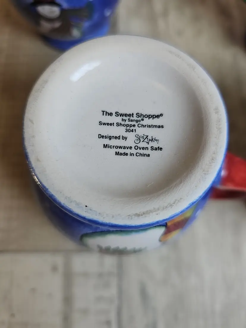 Sango, Sweet Shoppe, Christmas mugs, snowman, Sue Zipkin, 4 piece set, 3041-50, holiday kitchen, microwave safe, gift ready