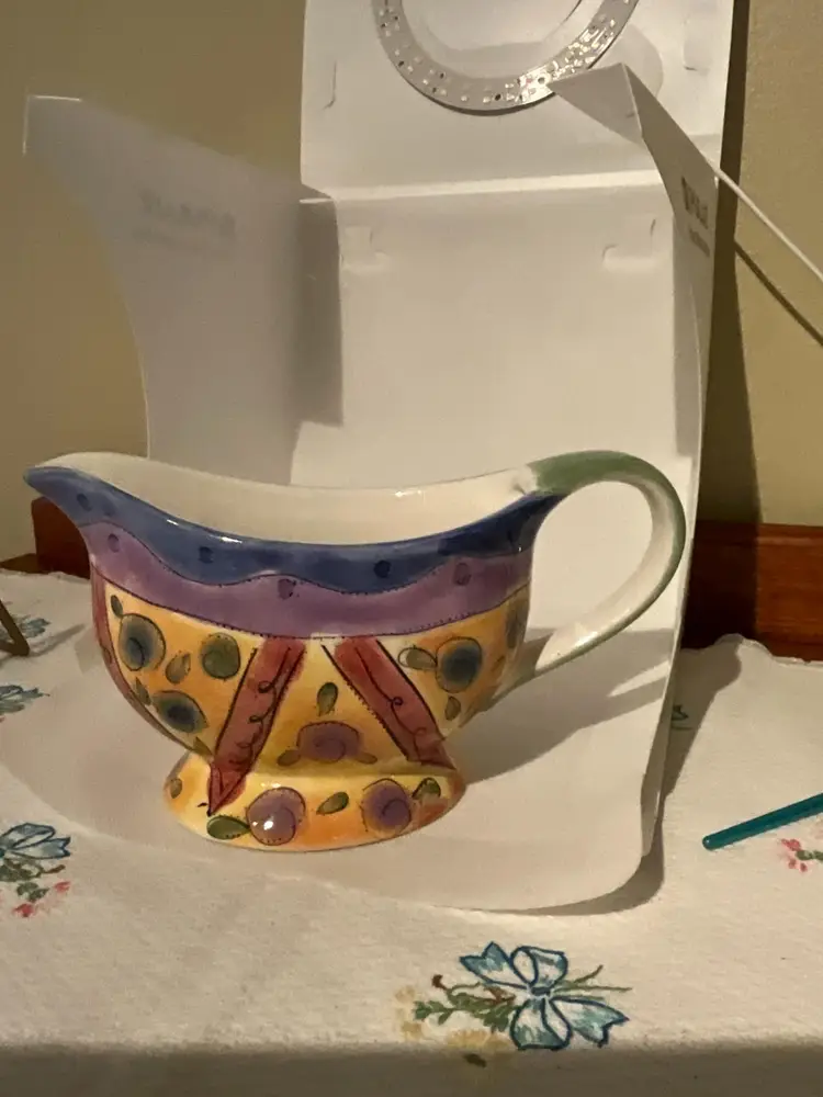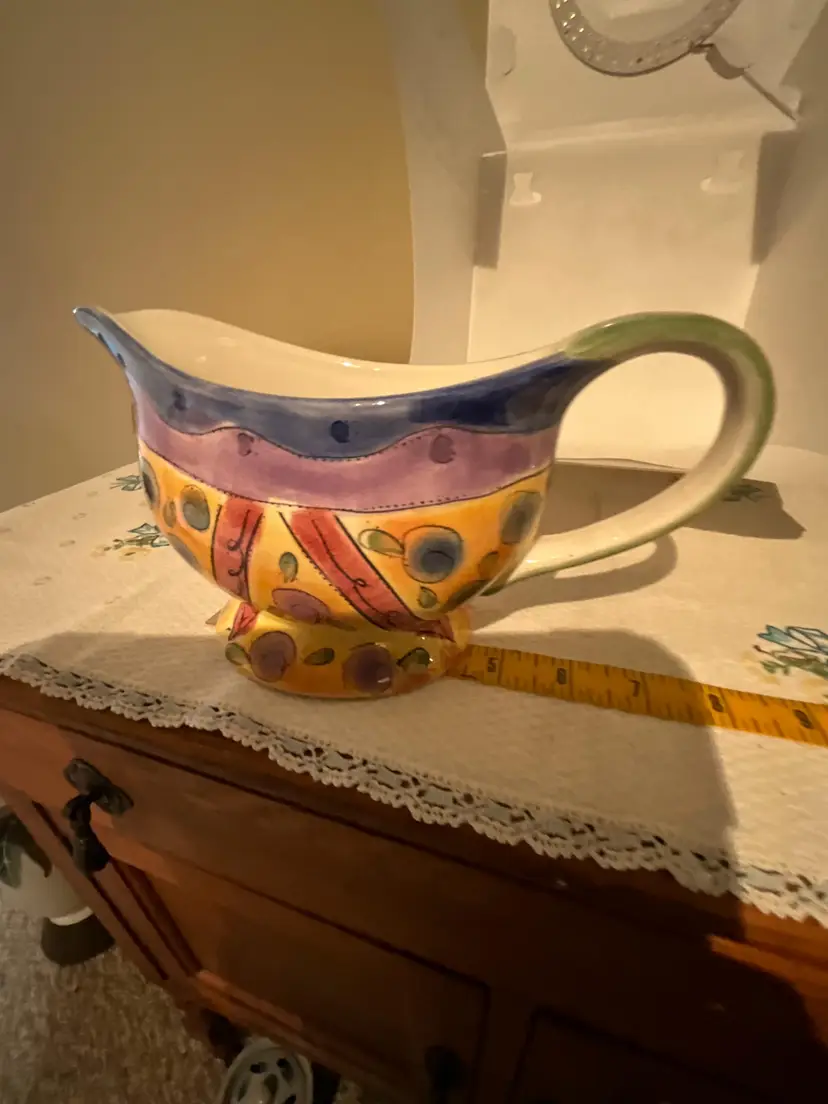 This vibrant hand-painted ceramic pitcher features a whimsical design with a mix of colorful patterns and floral motifs. Perfect for adding a splash of color to your kitchen or dining room. Excellent condition. Please refer to the pictures for details.