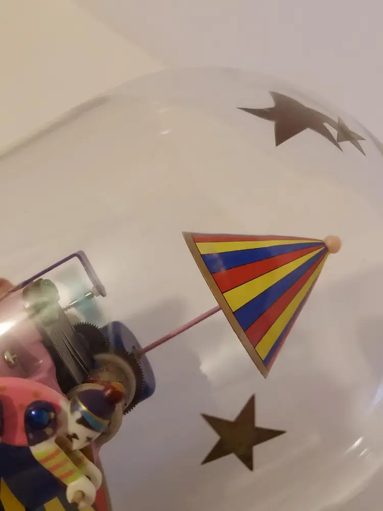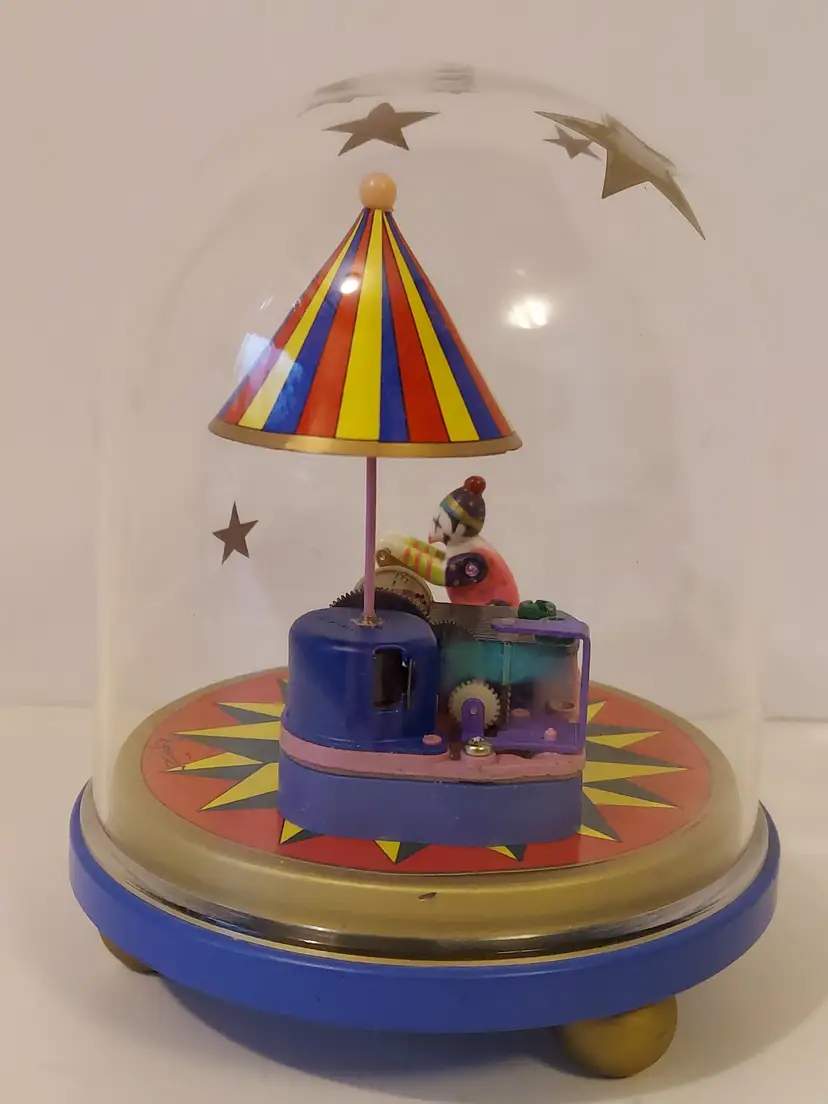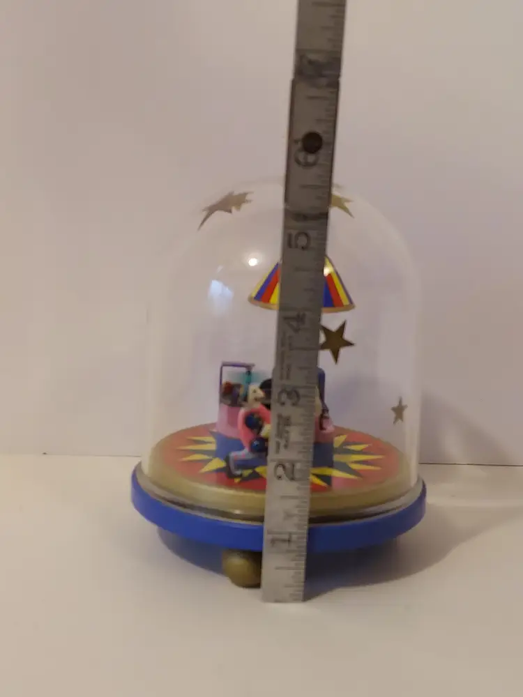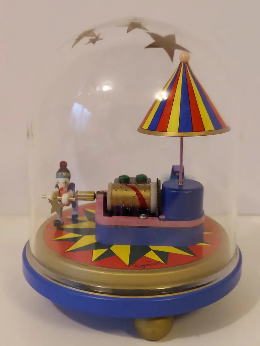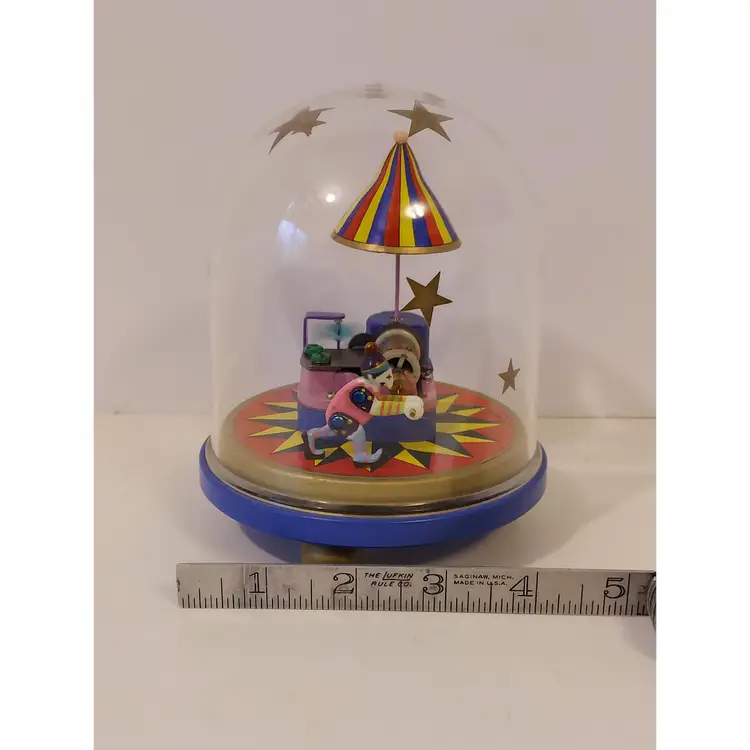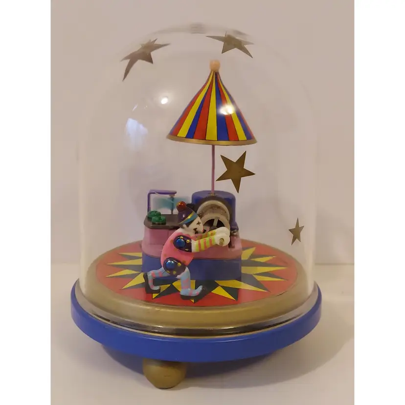 This cute little animated clown turns the umbrella as the tune "Love Makes The World Go Round" plays. It measures approximately 5.5×4 inches and is in good used condition; there are a few minor scratches/abrasions on the dome, please see photos.