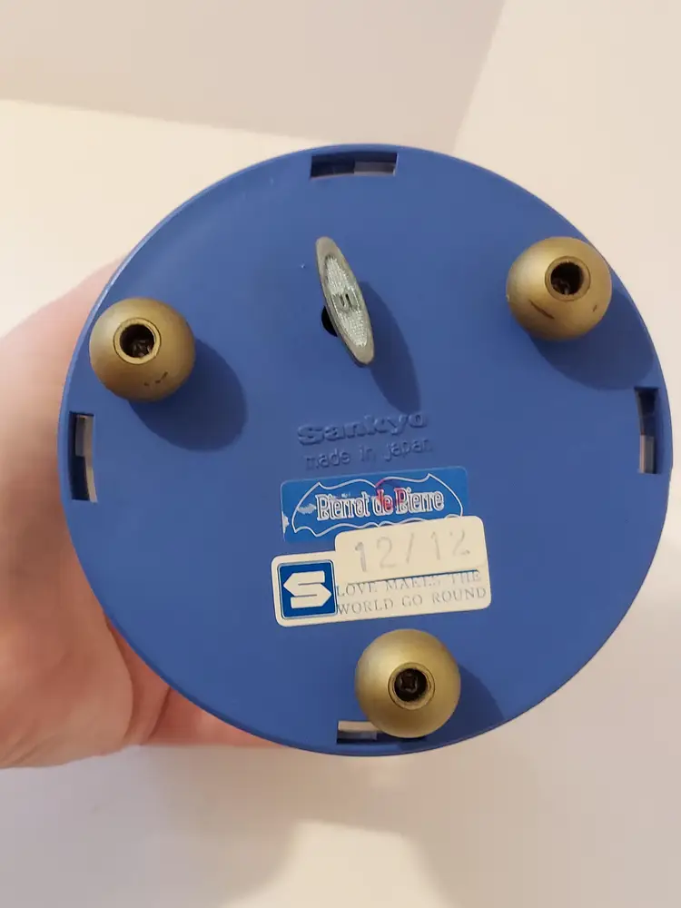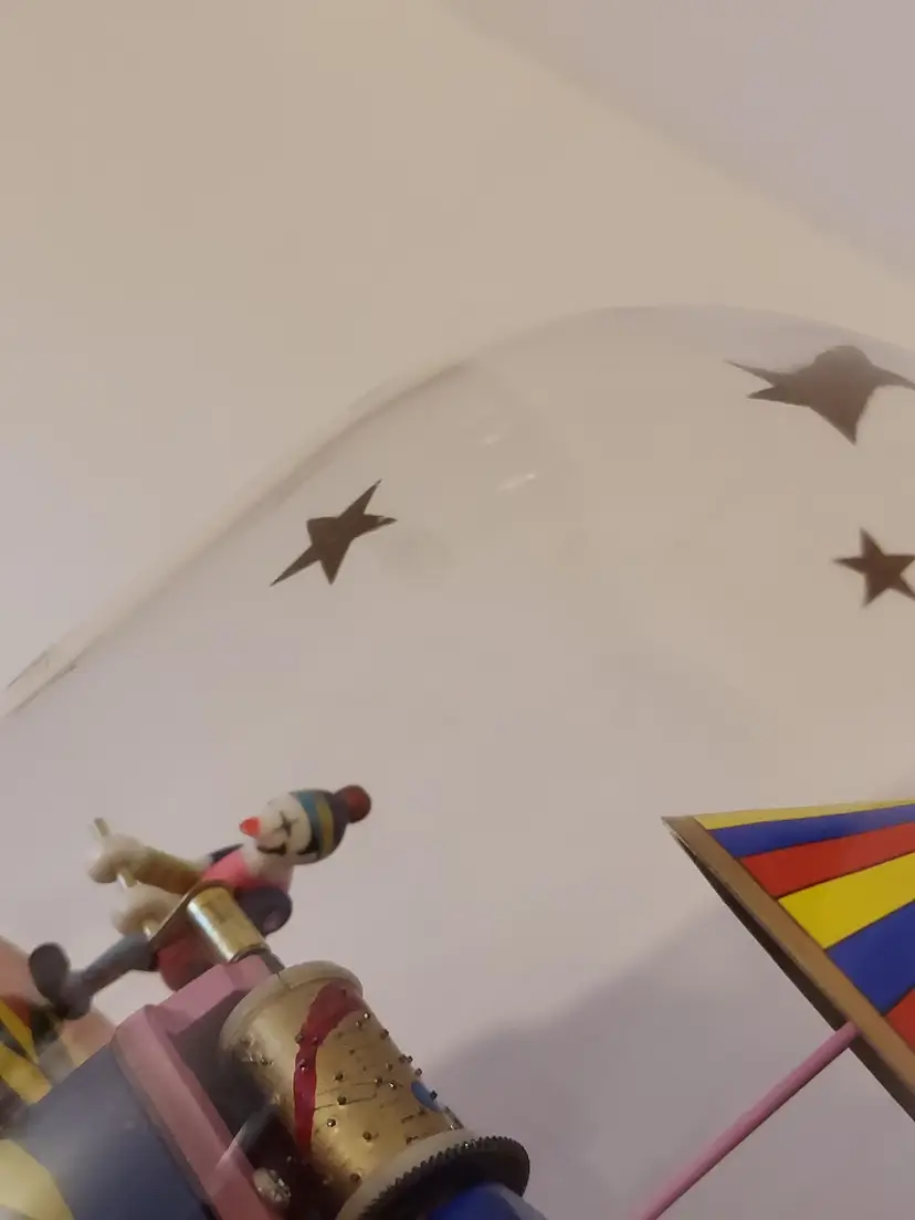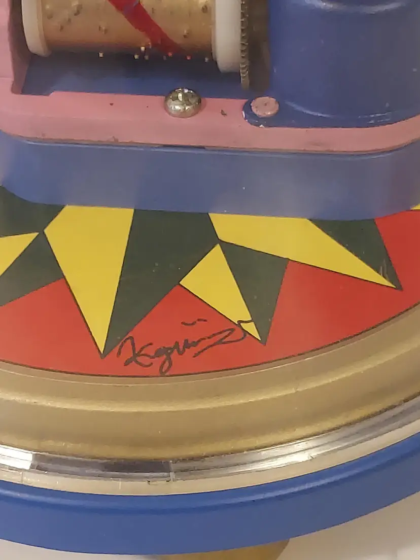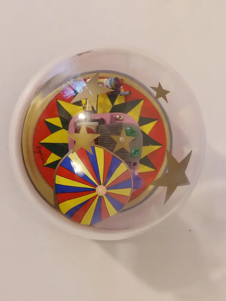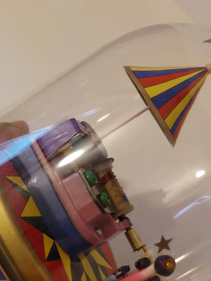 This cute little animated clown turns the umbrella as the tune "Love Makes The World Go Round" plays. It measures approximately 5.5×4 inches and is in good used condition; there are a few minor scratches/abrasions on the dome, please see photos.