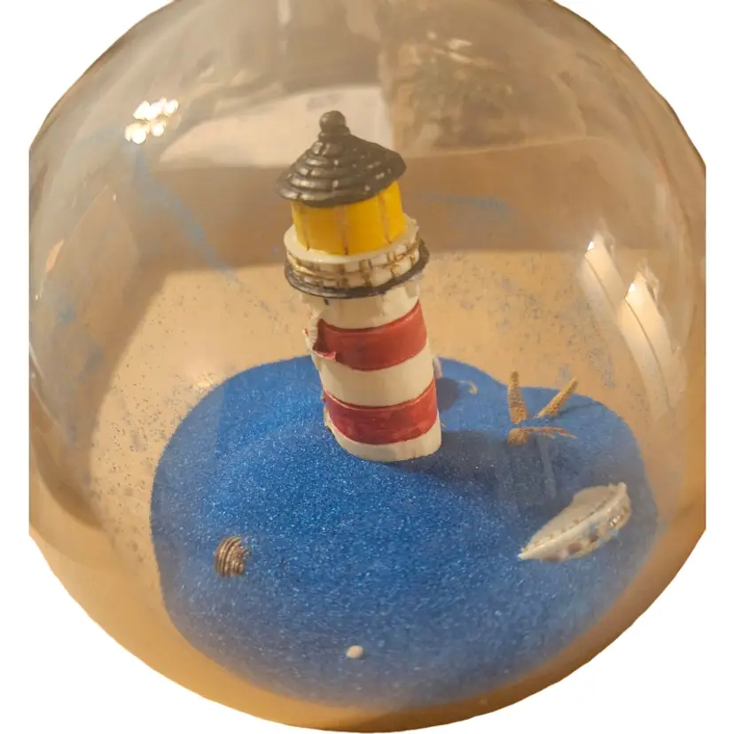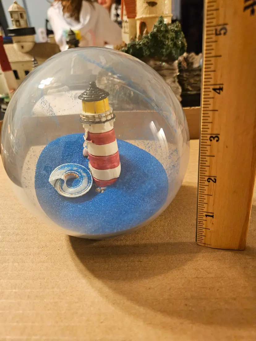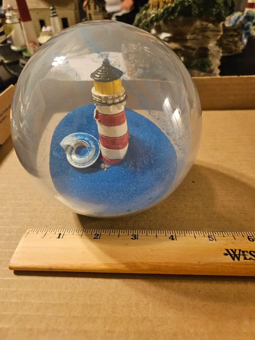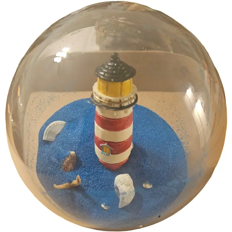 The globe features a miniature lighthouse with red and white stripes and a black top.