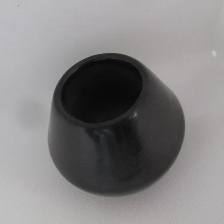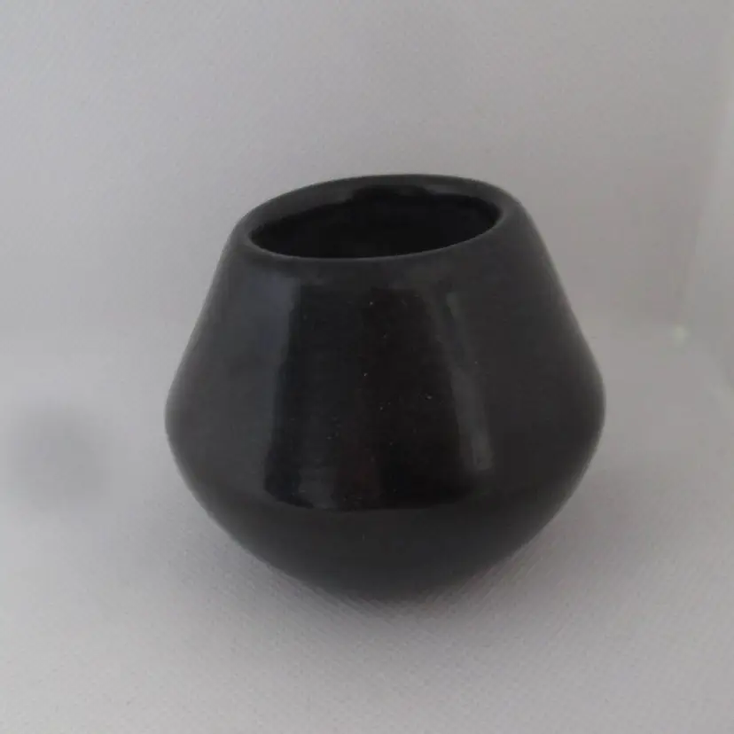 Santa Clara Pueblo Burnished Blackware Seed Pot. The pot measures 3" across and 2 1/2" tall. Note it is angled. The smooth finish was accomplished by rubbing a smooth rock against the pot for a very long time. This is an unsigned pot which means it is pre 1950's.