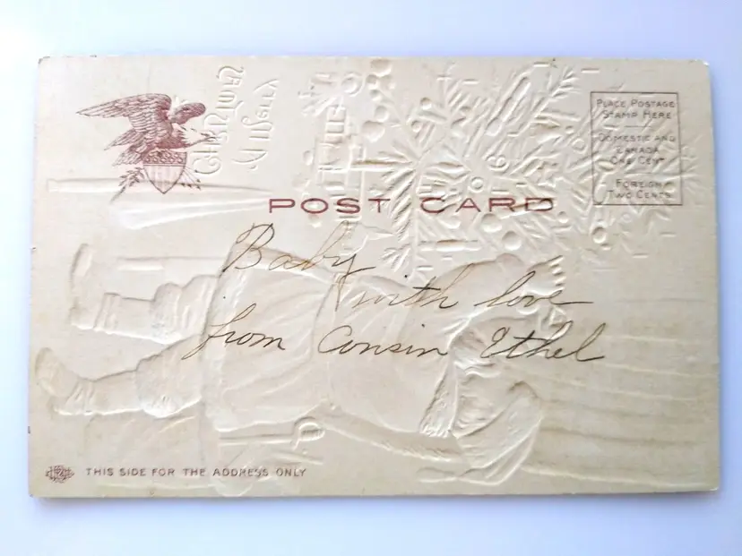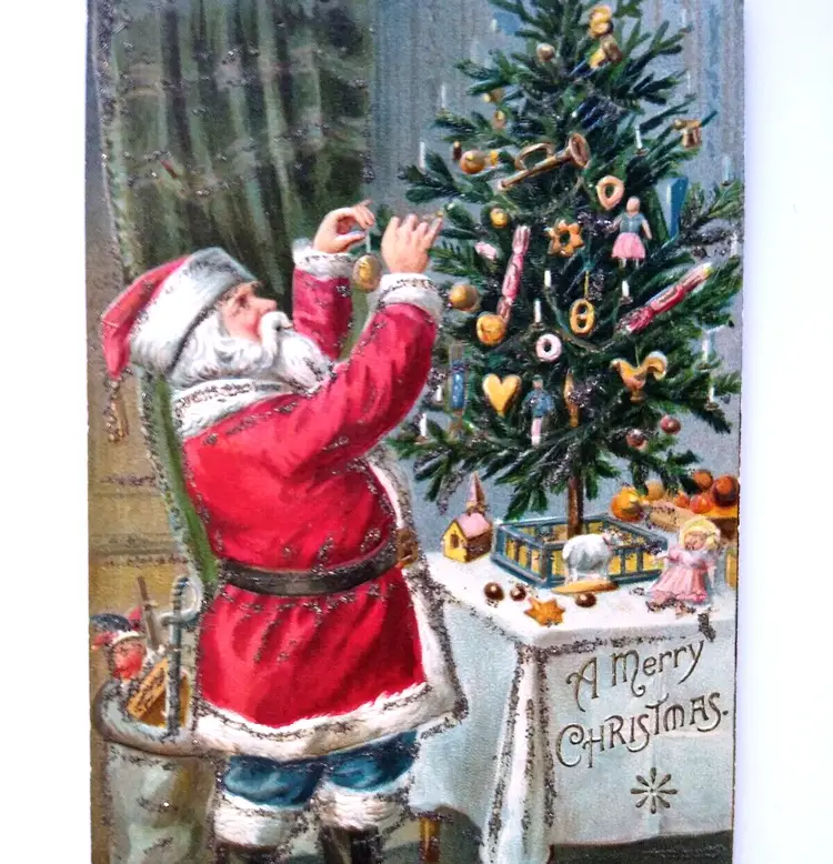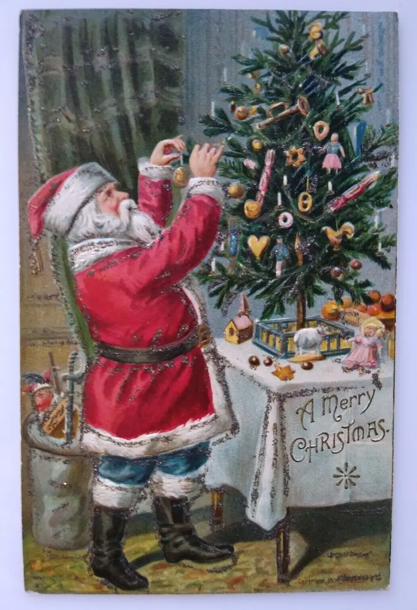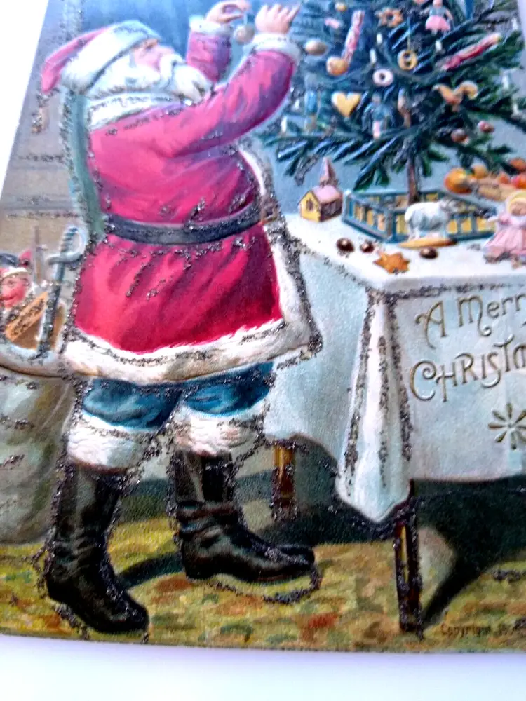 Artist: Unknown Number of Items in Set: 1 Unit of Sale: Single Unit Occasion: Christmas Size: Standard (5.5 x 3.5 in) Custom Bundle: No Material: Paper Year Manufactured: 1910 Original/Licensed Reprint: Original Brand/Publisher: P. Sanders Subject: Santa Type: Printed (Lithograph) Era: Pre-War (Pre-1914) Theme: Art, Fantasy, Greetings, Holiday, Saint Nick, Kris Kringle, Father Christmas, Christmas Tree, Glitter Features: Divided Back, Embossed Time Period Manufactured: 1900-1919 Country/Region of Manufacture: United States Postage Condition: Unposted