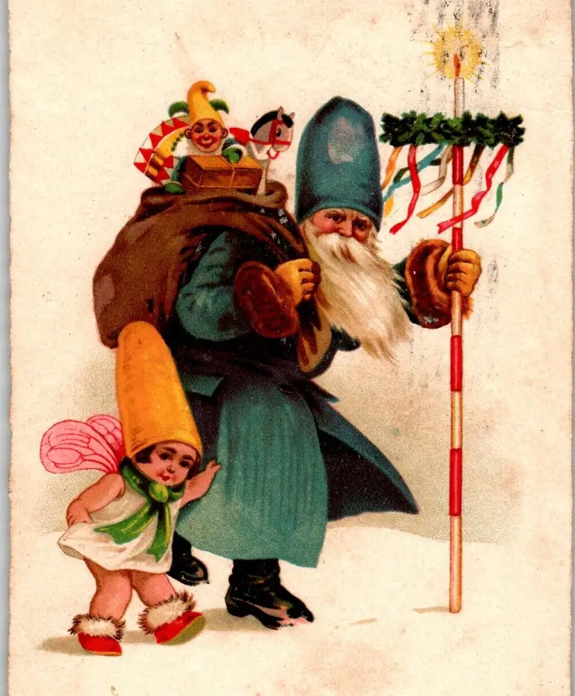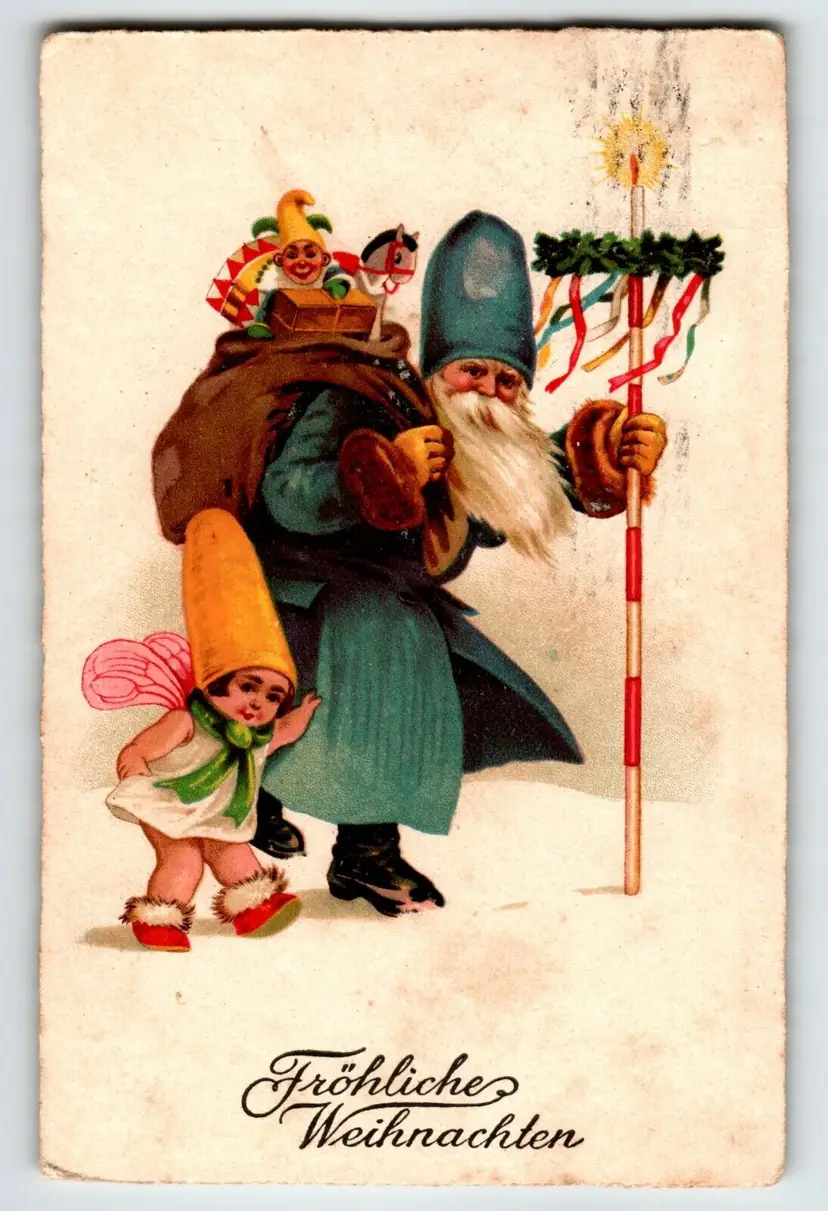 Unit of Sale: Single Unit Artist: Unknown Number of Items in Set: 1 Occasion: Christmas Size: Standard (5.5 x 3.5 in) Signed: No Custom Bundle: No Material: Paper Year Manufactured: 1908 Original/Licensed Reprint: Original Brand/Publisher: WSSB Subject: Santa Personalize: No Type: Printed (Lithograph) Era: Pre-War (Pre-1914) Theme: Art, Children & Infants, Fantasy, Greetings, Holiday, Santa Claus, Saint Nicholas, Old World, Old World Santa, Christmas Tree, Blue Suit, Blue Coat, German Text, Pole, Tall Hat Features: Divided Back Time Period Manufactured: 1900-1919 Country/Region of Manufacture: Germany Postage Condition: Posted