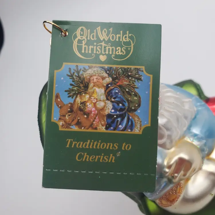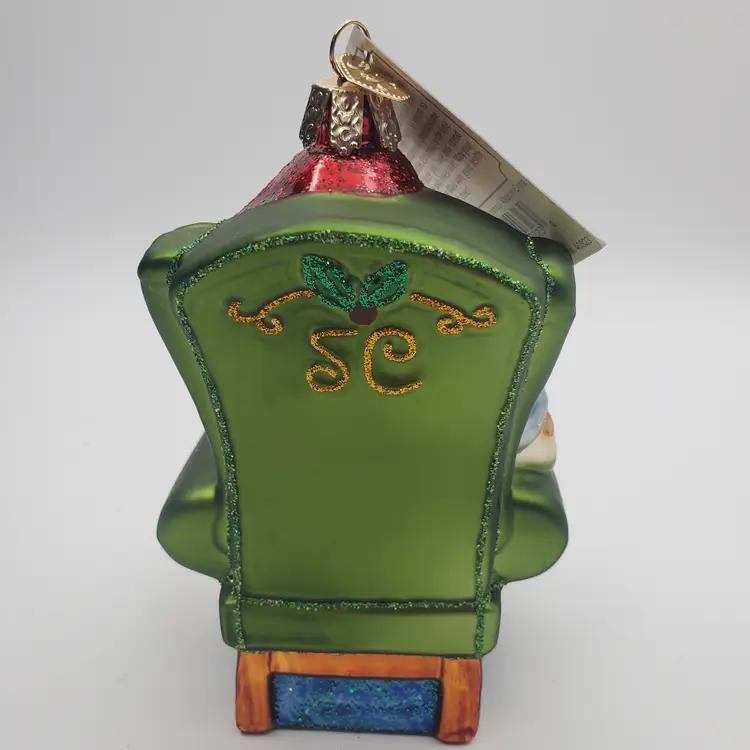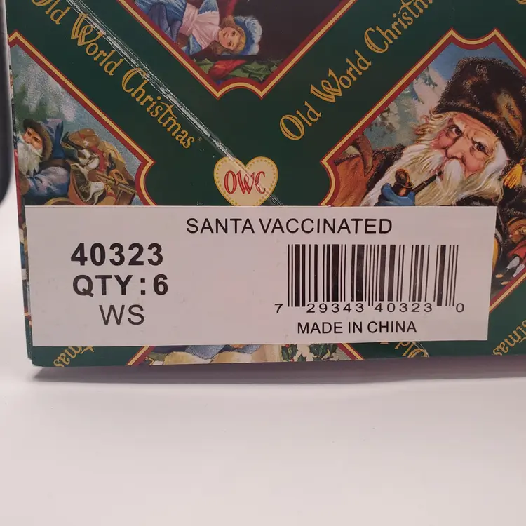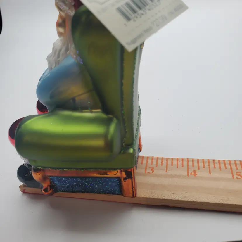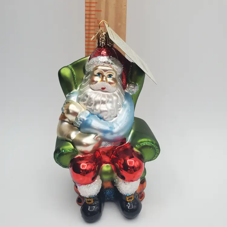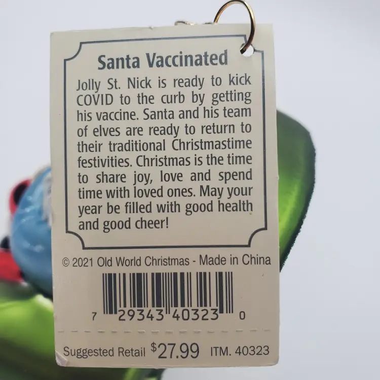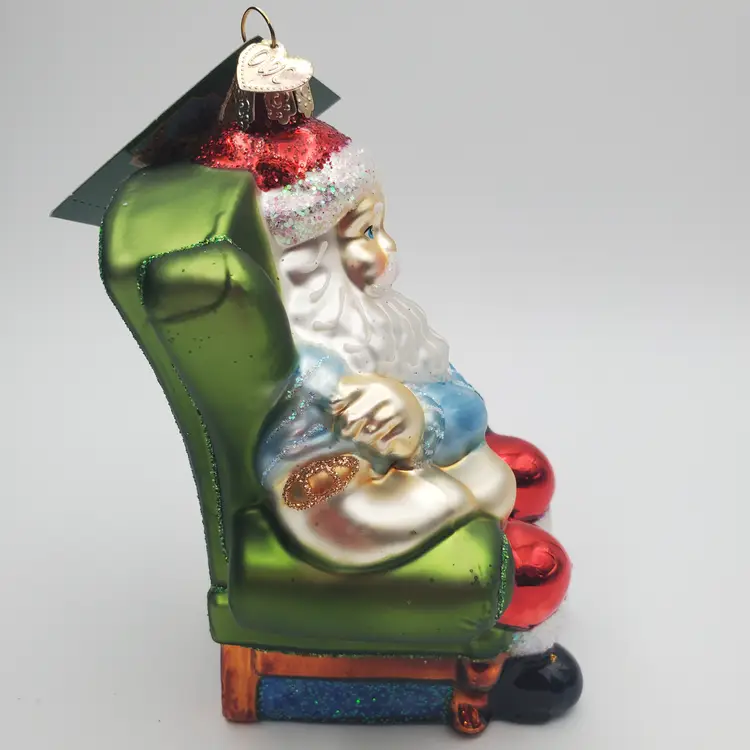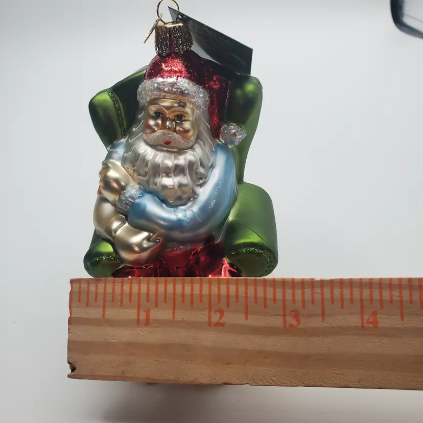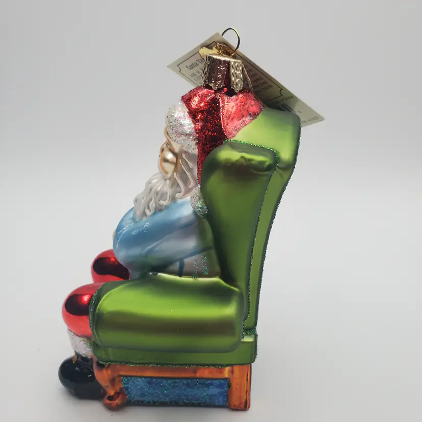 Whimsical set of six ornaments of covid vaccinated Santa on his recliner!