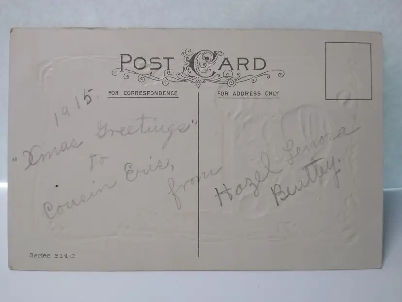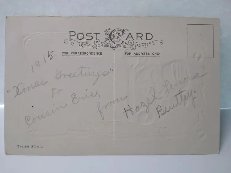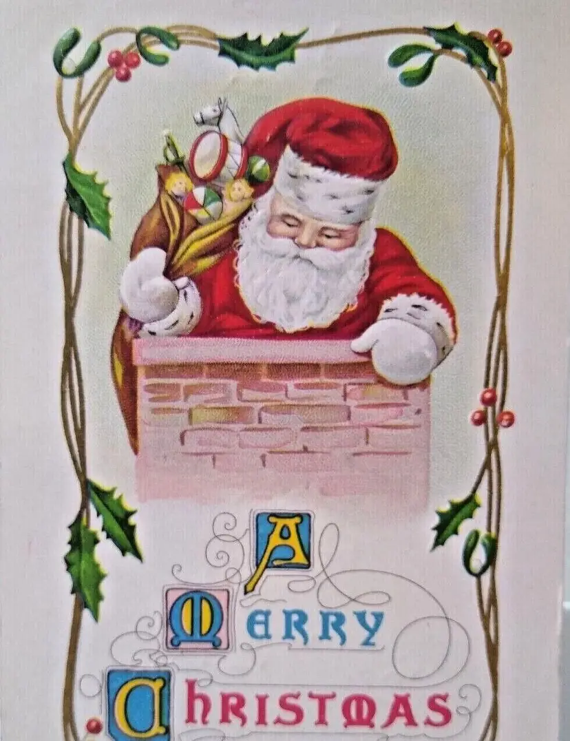 Antique vintage original embossed Christmas postcard. Has corner dings and age wear. Writing on back non posted. Stock #Santa409.