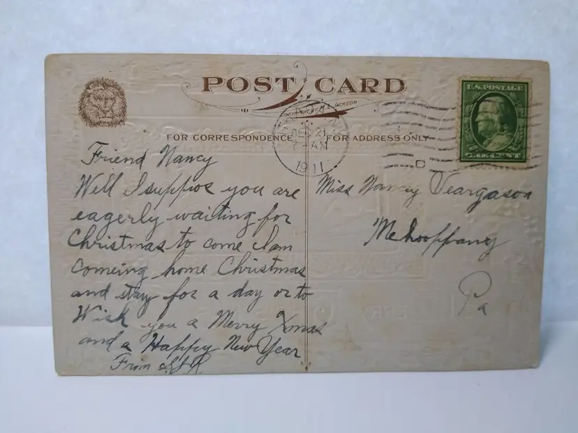 Number of Items in Set: 1 Unit of Sale: Single Unit Artist: Unknown Featured Person: Santa Occasion: Christmas Size: Standard (5.5 x 3.5 in) Signed: No Custom Bundle: No Year Manufactured: 1911 Material: Paper Original/Licensed Reprint: Original Franchise: Lions Head Brand/Publisher: M.L. Jackson Subject: Santa Personalize: No Type: Printed (Lithograph) Era: Pre-War (Pre-1914) Theme: Fantasy, Greetings, Holiday, Santa, Saint Nicholas, Kris Kringle Features: Divided Back, Embossed Time Period Manufactured: 1900-1919 Country/Region of Manufacture: Unknown Postage Condition: Posted