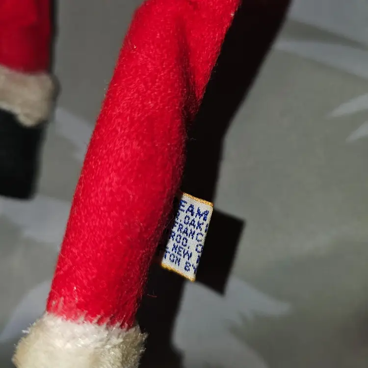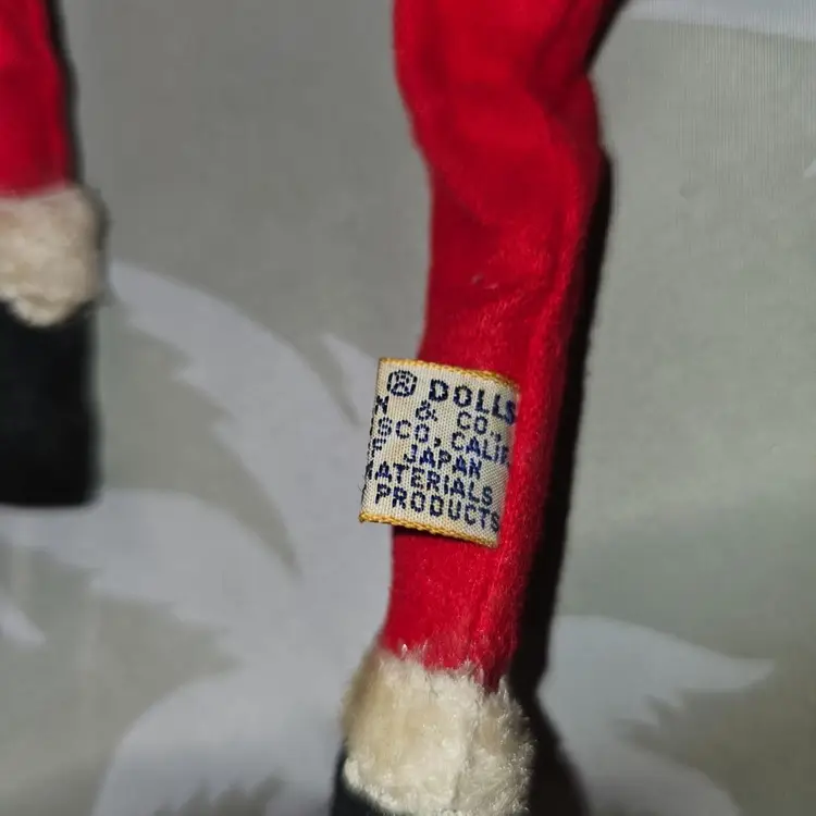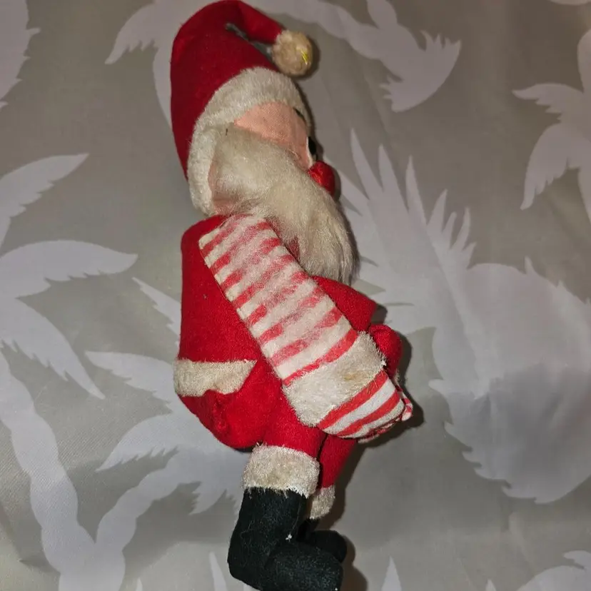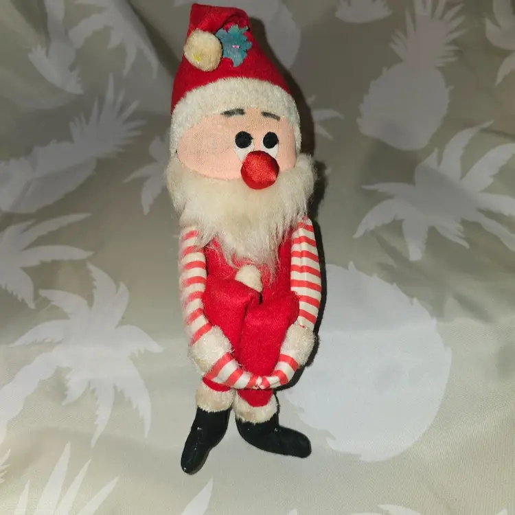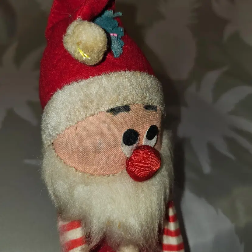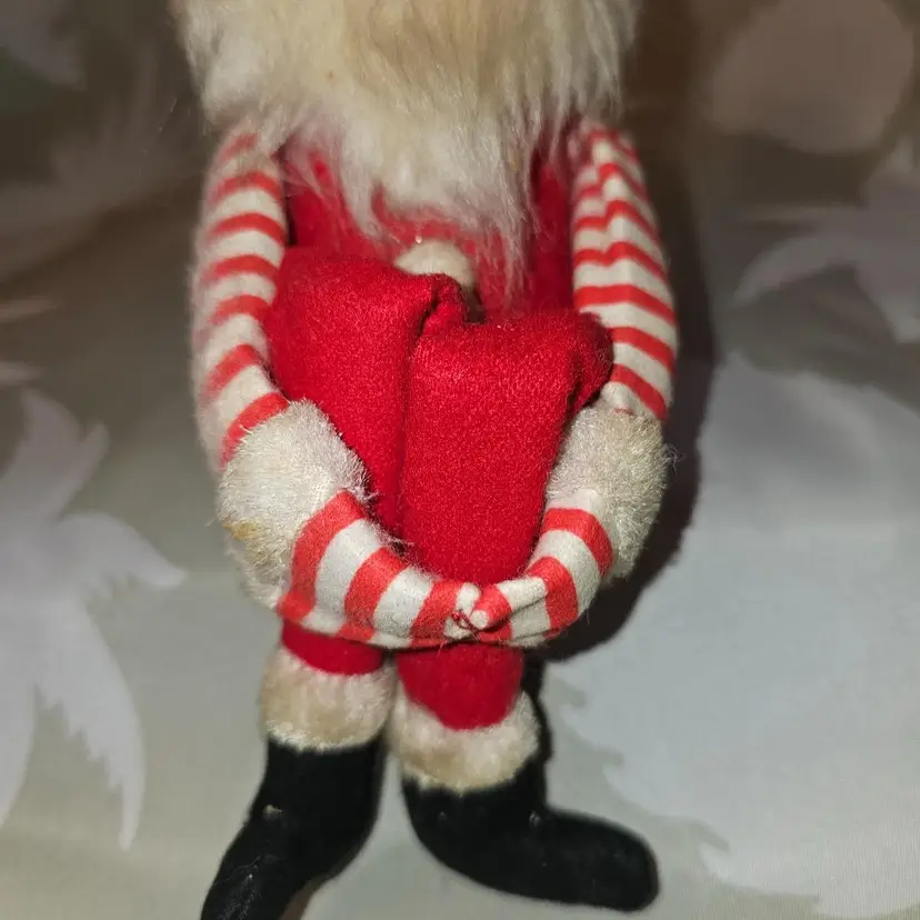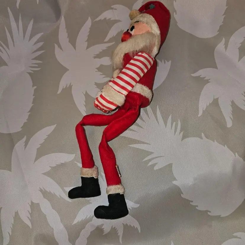 Santa or elf knee Hugger Makes gentle chime sound when moved ( Chimes are in body) Approx 10" while holding knees, 14" stretched out Shows some dirt and wear as pictured