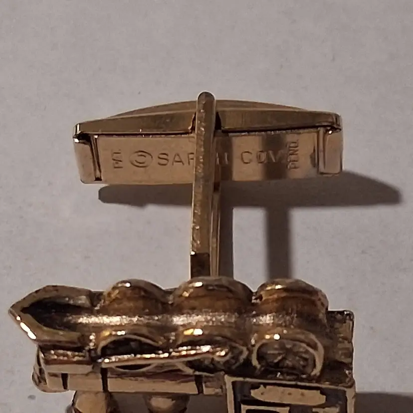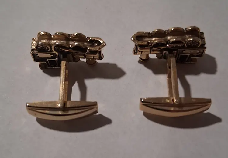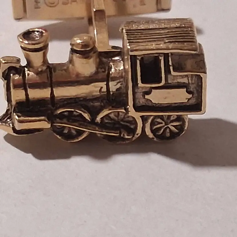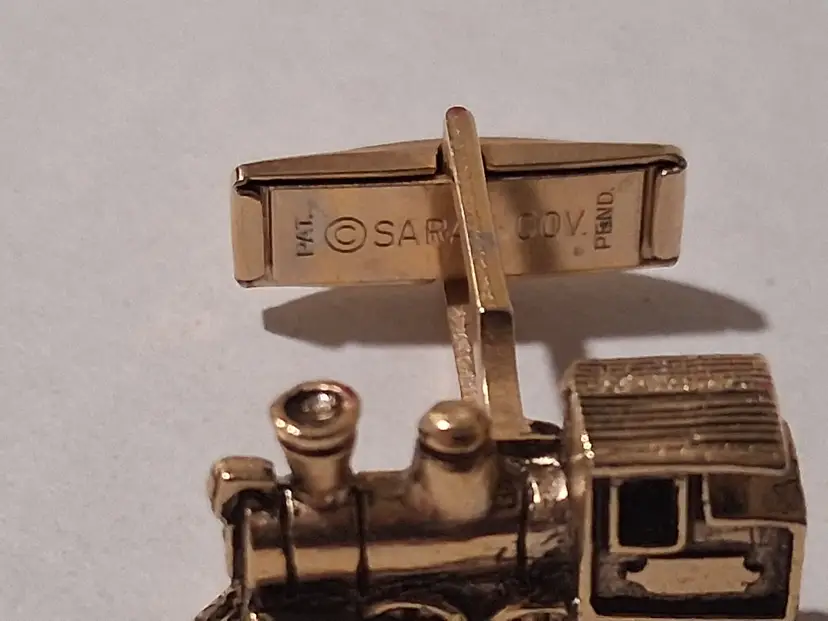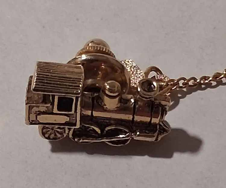 This vintage Santa Fe Train Engine Cuff Links & Tie tack Set in gold tone by Sarah Coventry is a unique and stylish accessory for men. Featuring a rectangular shape, this set is perfect for occasions like engagements, weddings, anniversaries, birthdays, and even Christmas and Father's Day. The metal materials sourced from the United States add a touch of nostalgia to the design, making it a perfect gift for those who appreciate vintage jewelry and have a love for vehicles and transportation.
