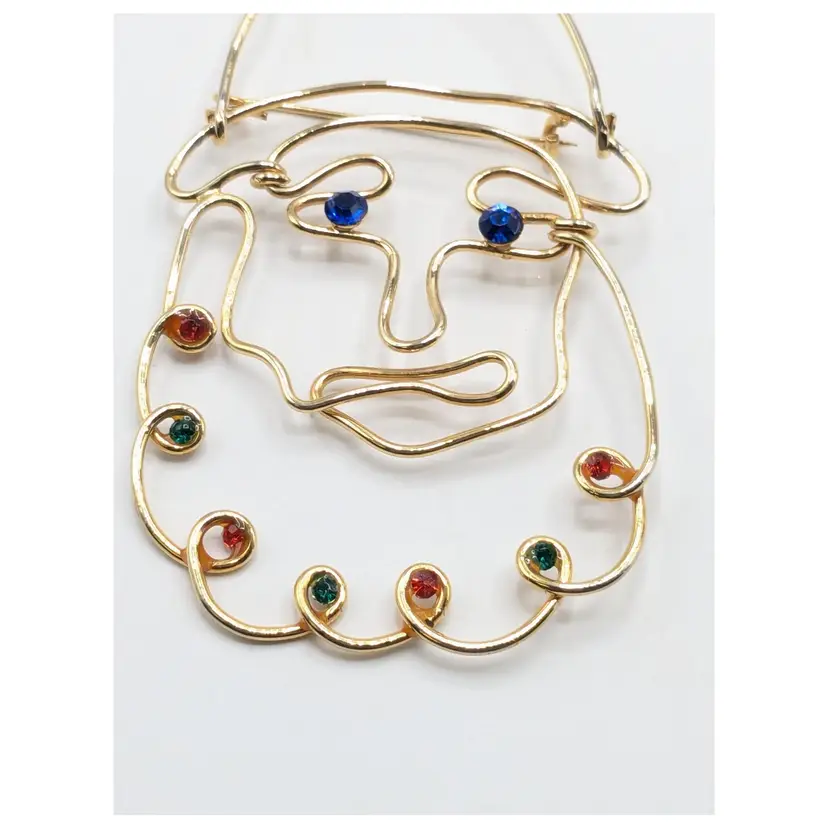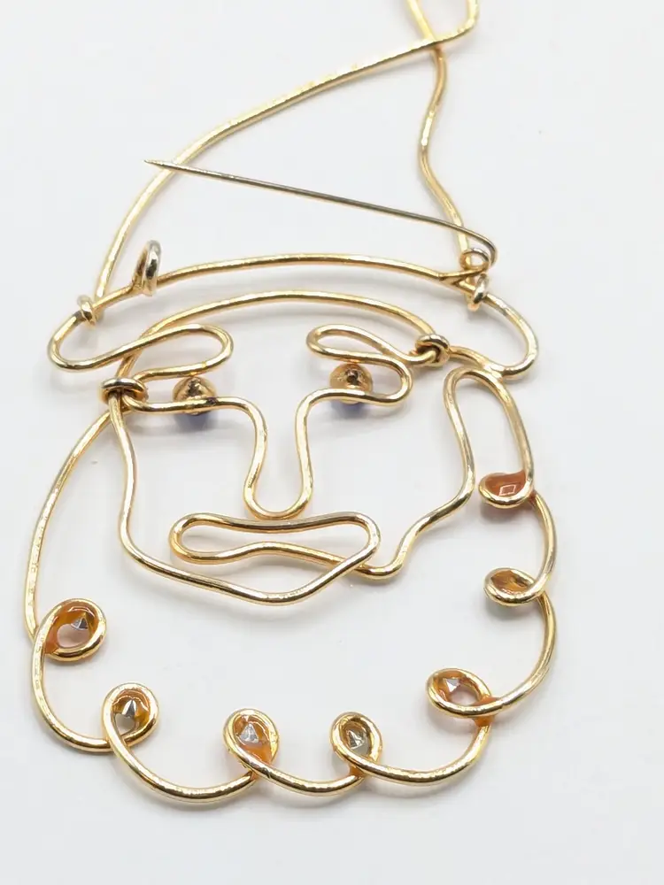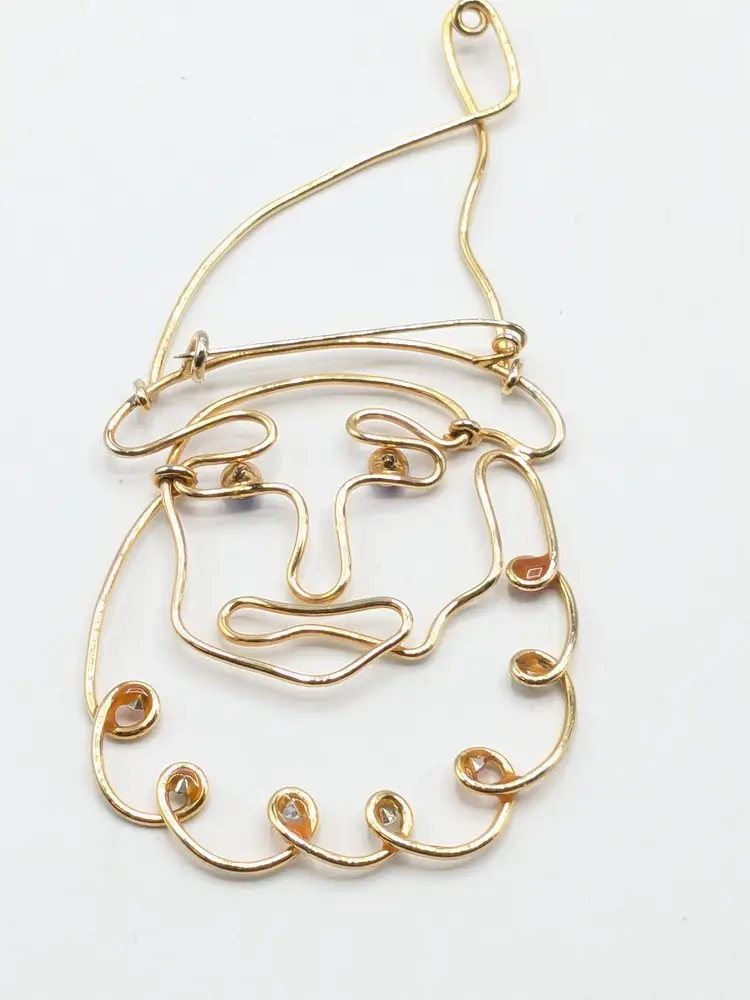 Unique handcrafted vintage brooch featuring a wireframe Santa Claus face adorned with colorful rhinestones. Can be hung as a pendant or worn as a brooch. Good condition. Measures approximately 4 inches in height and 2" wide. (EN1)