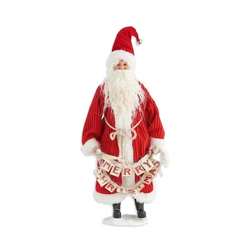Santa Holding Merry Christmas Banner on Base 19 Inches. This adorable Santa is perfect for any mantle or table center piece. Adds a Winter festive feel to any home!! Adorable Décor Santa. With intricate detail and made with high quality material. Will bring a smile to anyone's face! 21-10-5 shp1420