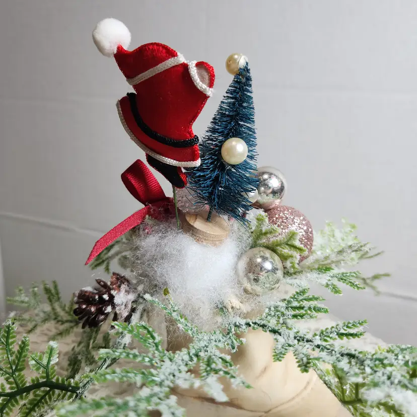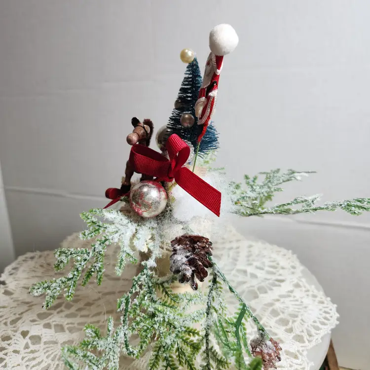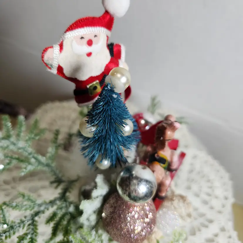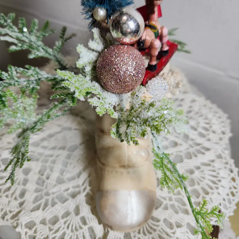 A hobbyist shoe in light pinks and pearl. Sitting on top with sparkling greens are a rocking horse a bottle brush tree and Santa.
