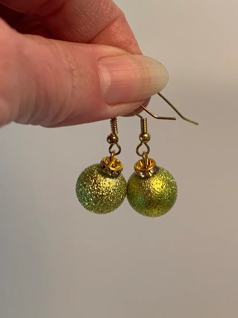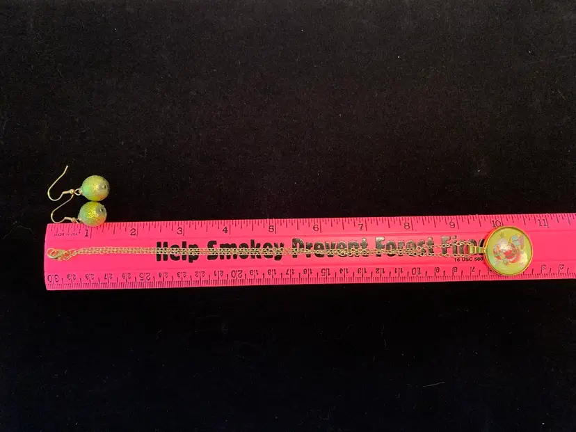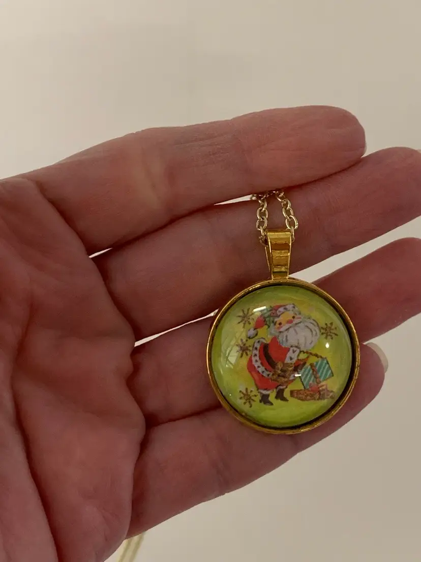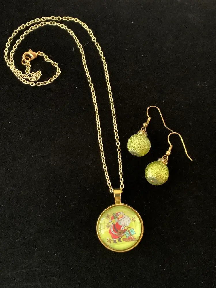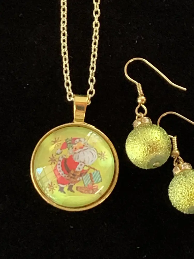Santa pendant made with an image from my large collection of vintage gift tags on a gold toned chain. Matching lime green ornament pierced earrings have gold toned fish hook style ear wires. Necklace is 9” in wearable length and earrings are a little over an inch in length.